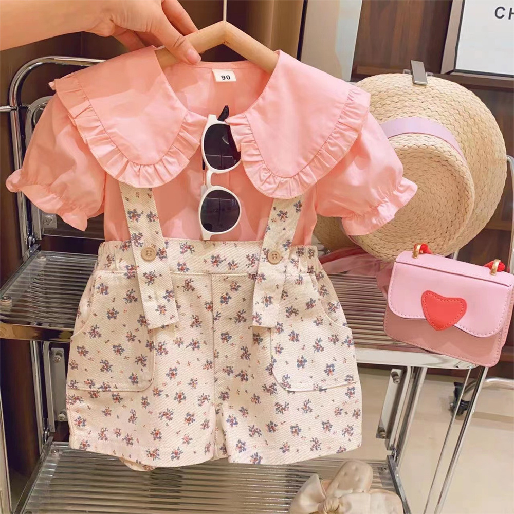 新品女童翻领喇叭短袖打底衫碎花吊带短裤两件套2025夏装套装
