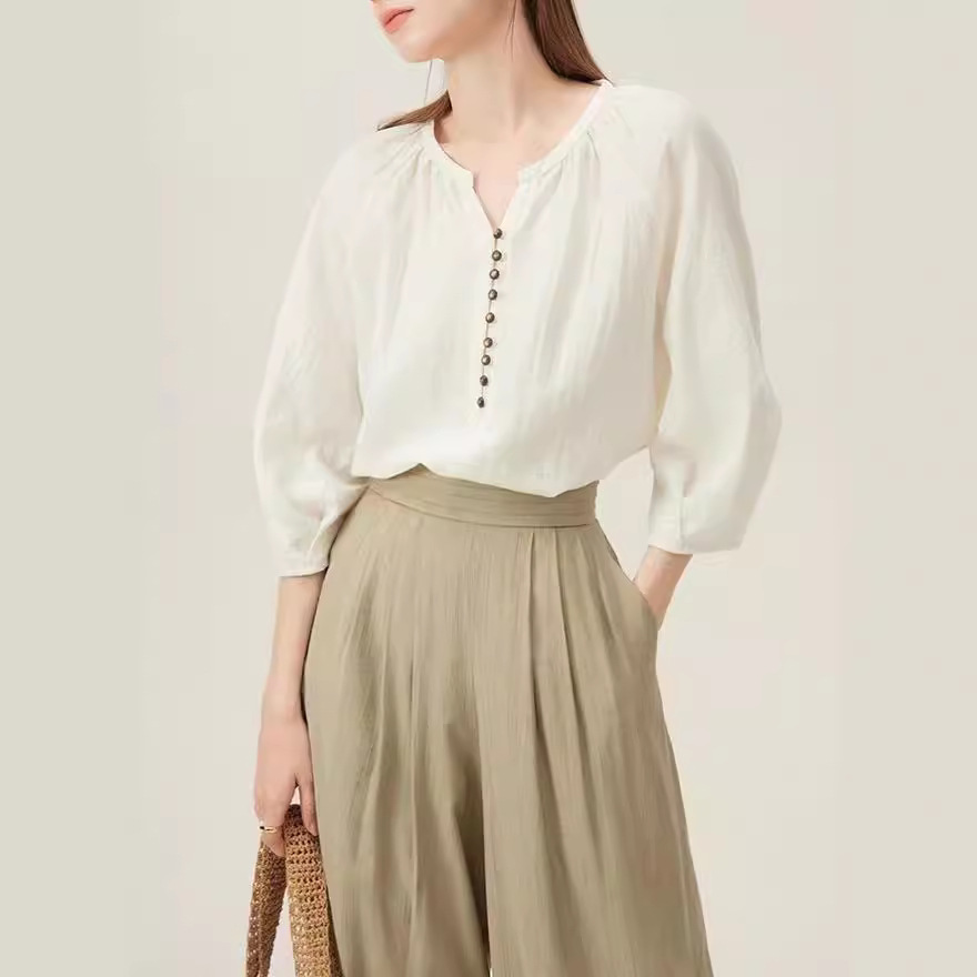 法式亚麻衬衫女夏款七分袖气质通勤上衣宽松慵懒风