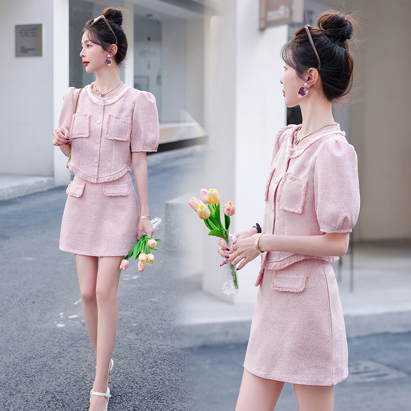 小香风套装裙女夏新款小个子气质甜辣chic短袖西装上衣两件套