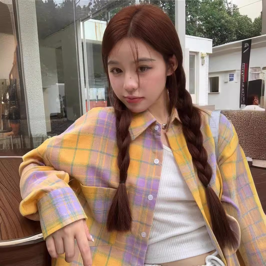 姜黄奶复古长袖格子衬衫女美式休闲宽松中长款衬衣外套
