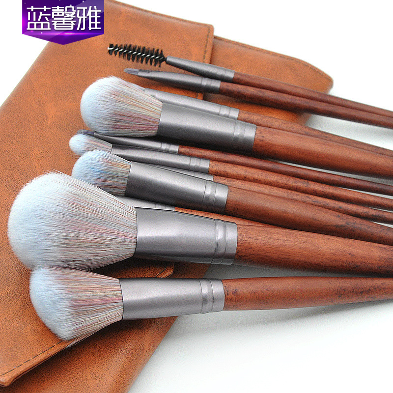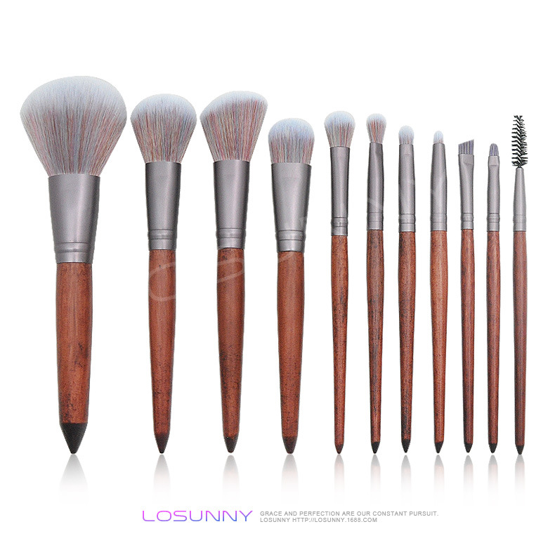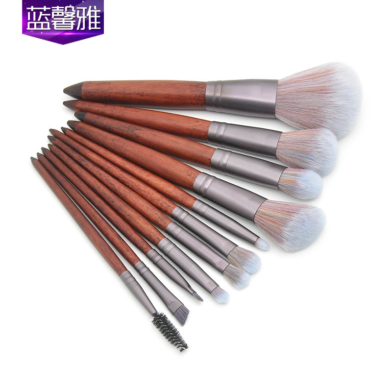 新款 11支木柄化妆刷套装 仿红木檀木色眼部刷3D混毛美妆彩妆工厂