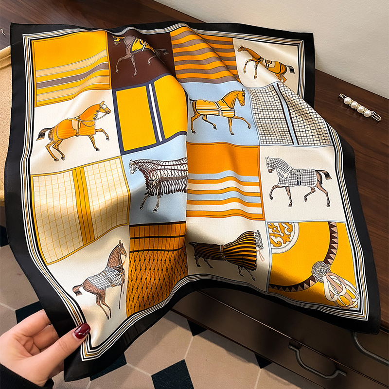 春季爆款宫格骏马真丝丝巾女时尚轻奢高级感桑蚕丝丝巾百搭53丝巾