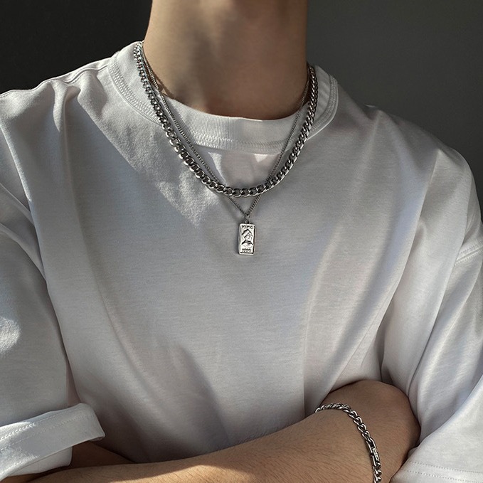 双层叠戴复古方牌人头像吊坠钛钢项链男士百搭不掉色高级感锁骨链