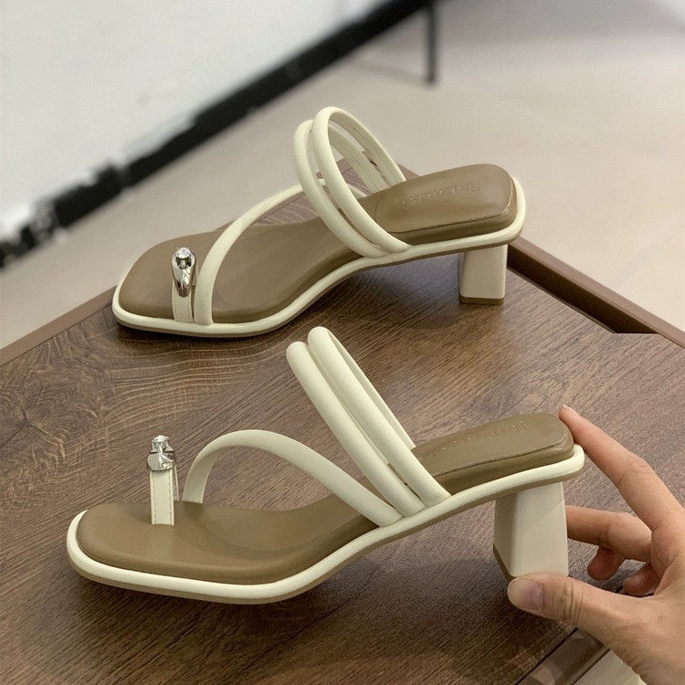 套趾凉拖鞋女外穿春新款法式中跟凉鞋花朵水钻粗跟凉拖鞋大码