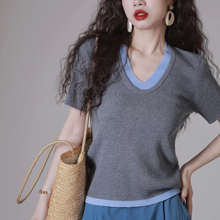 假两件撞色V领弹力针织衫夏季显瘦短袖正肩T恤女设计感小众上衣