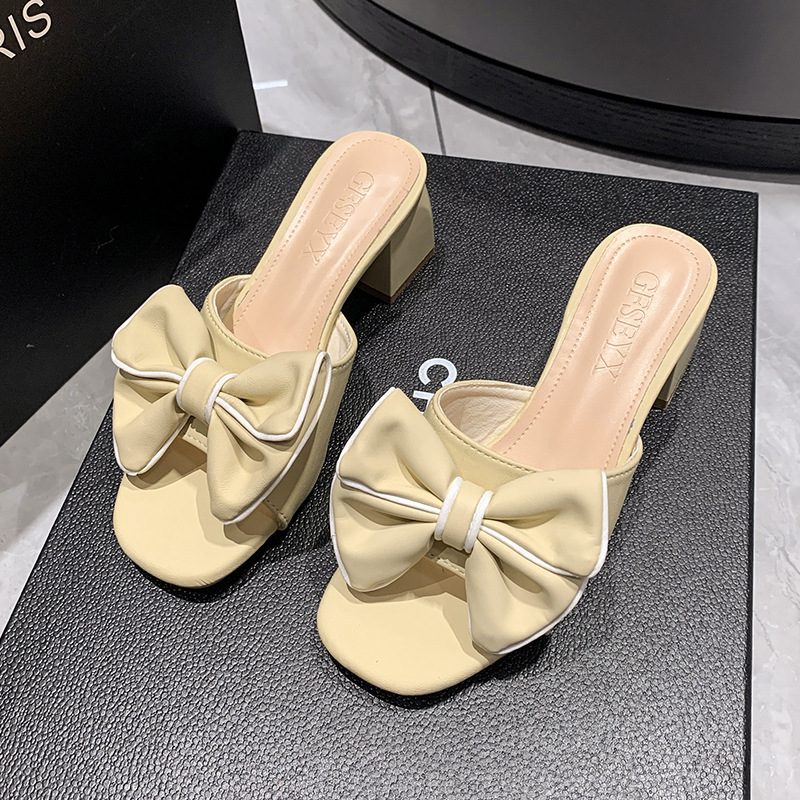 法式大码凉鞋新款方头高跟鞋中跟粗跟半拖蝴蝶结一字拖外穿