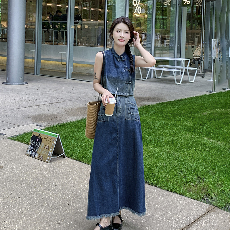 新中式牛仔马甲高腰半身裙两件套夏款国风复古无袖盘扣上衣裙套装