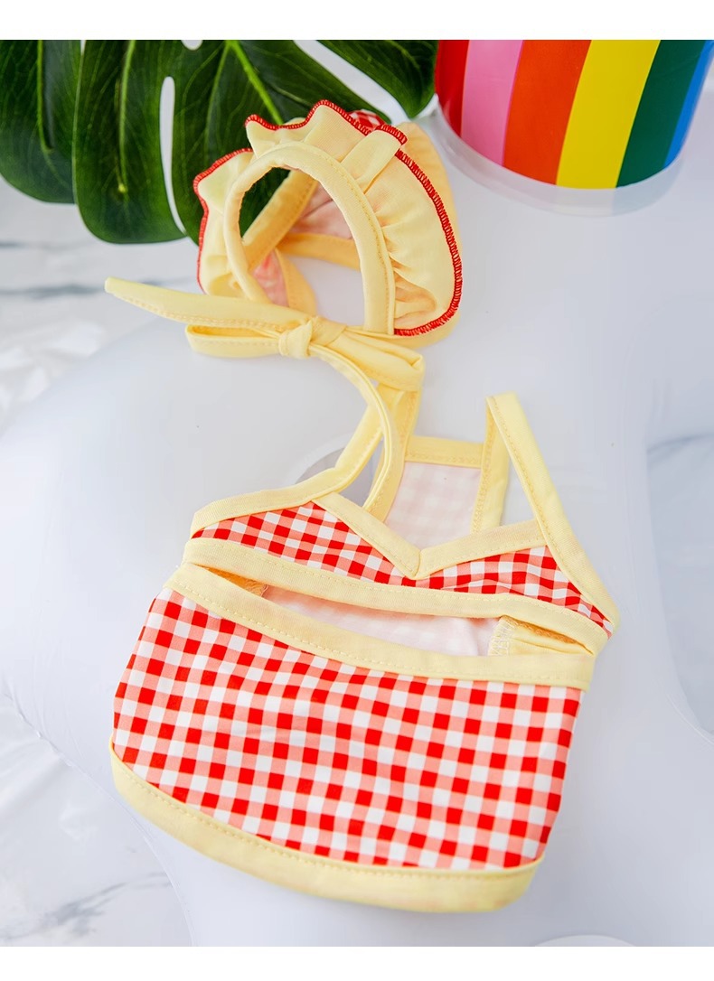 春夏狗狗新款游泳衣服彩色格子带盆帽连体吊带泳衣宠物服装衣服饰