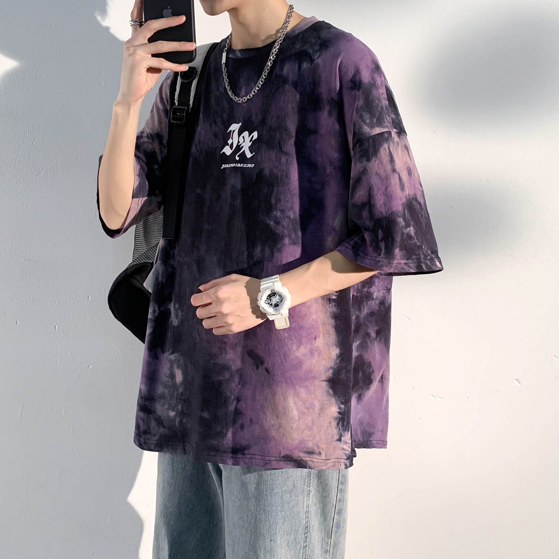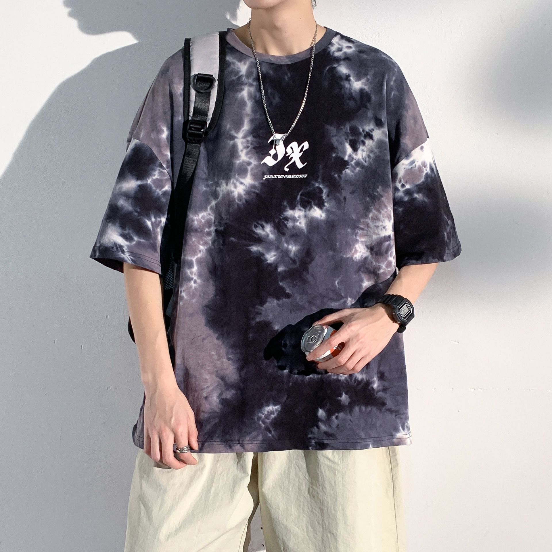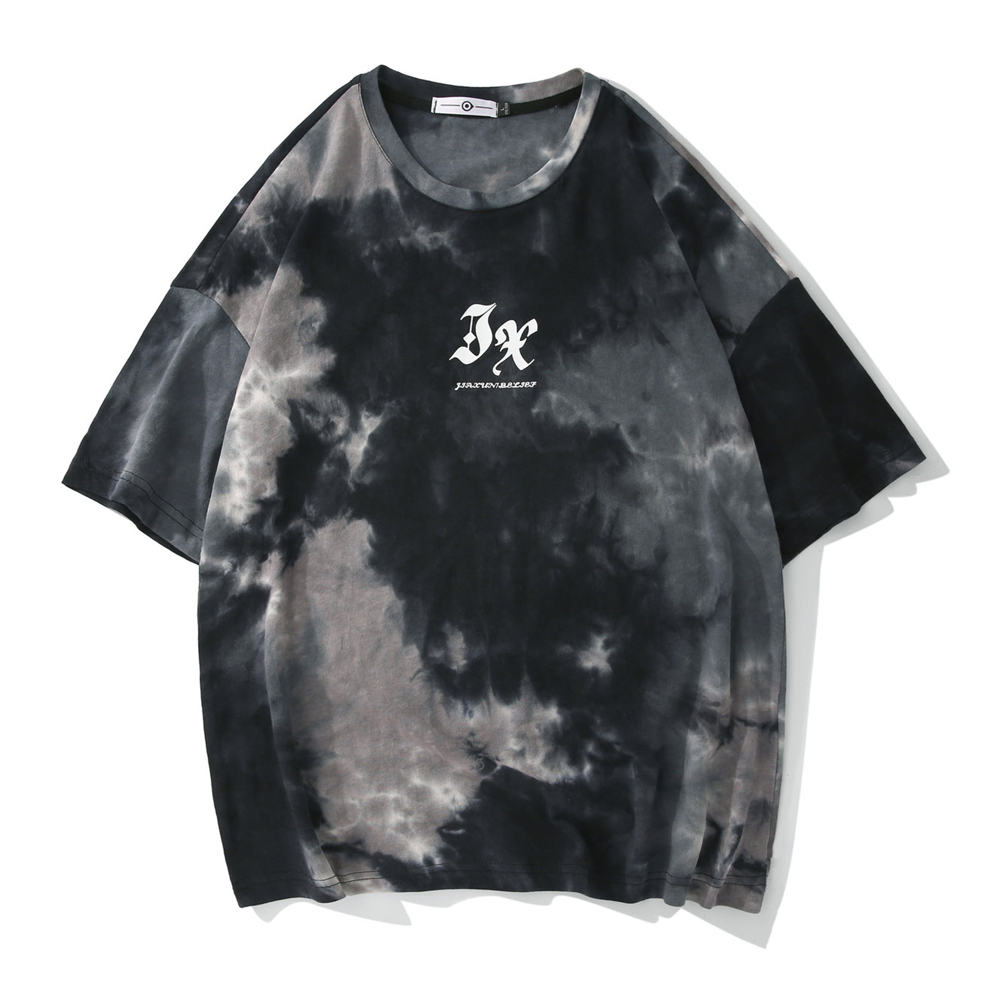 光影墙港风夏季情侣扎染圆领印花字母宽松短袖T恤