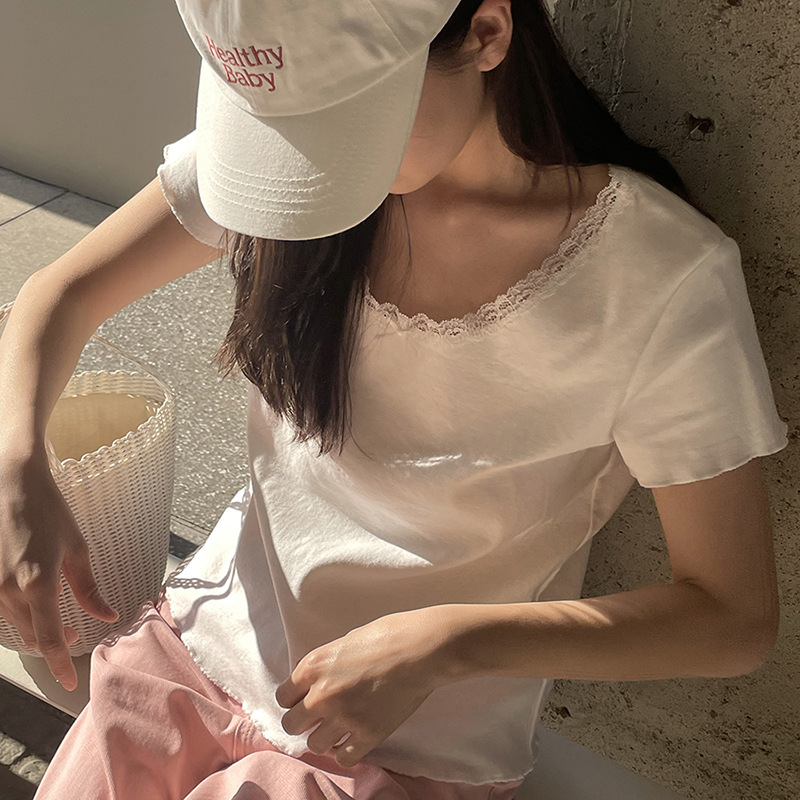 U领修身小飞袖上衣女夏新款领口蕾丝蝴蝶结亲肤舒适T恤