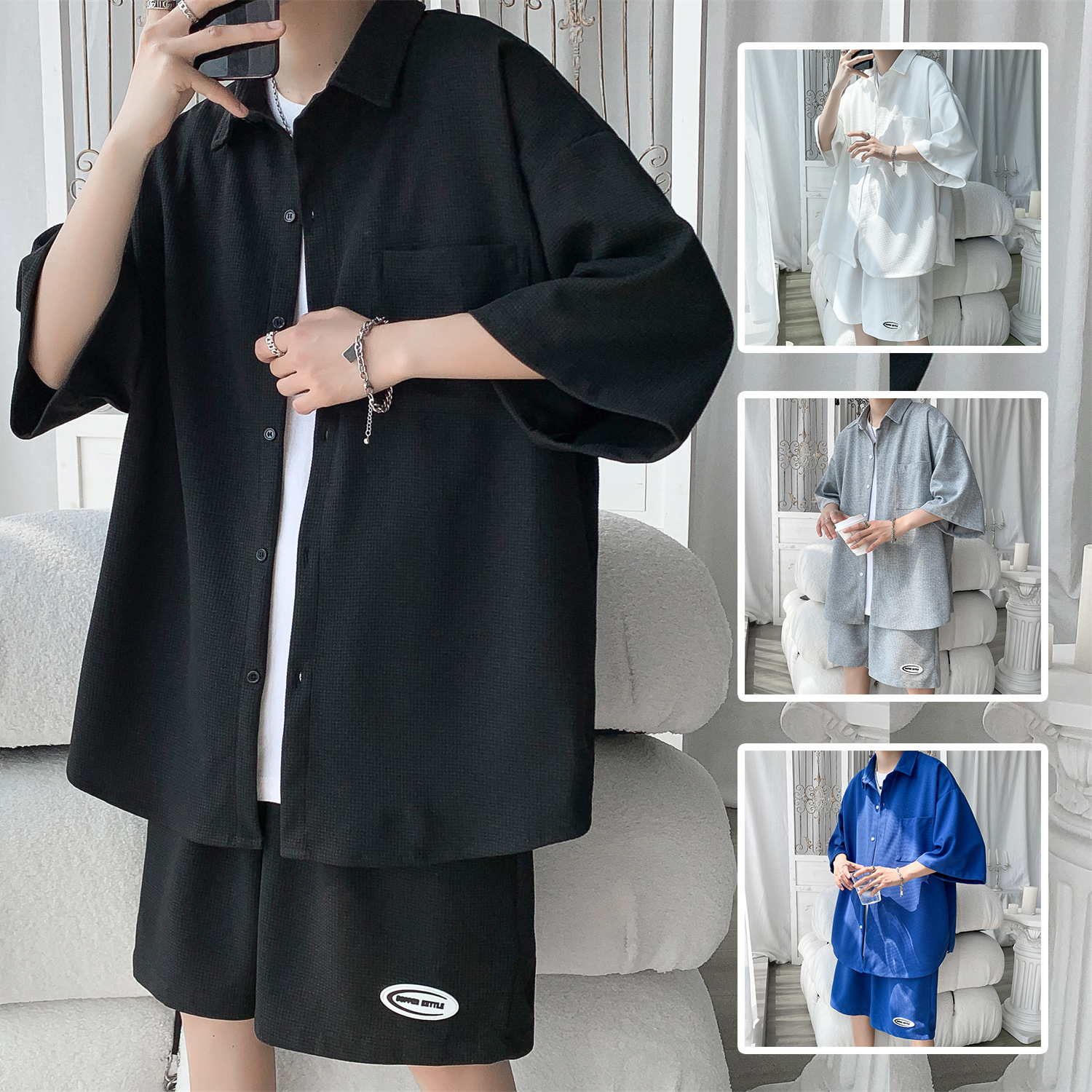 短袖衬衫套装男夏天男士休闲运动短袖衬衫休闲短裤两件套男