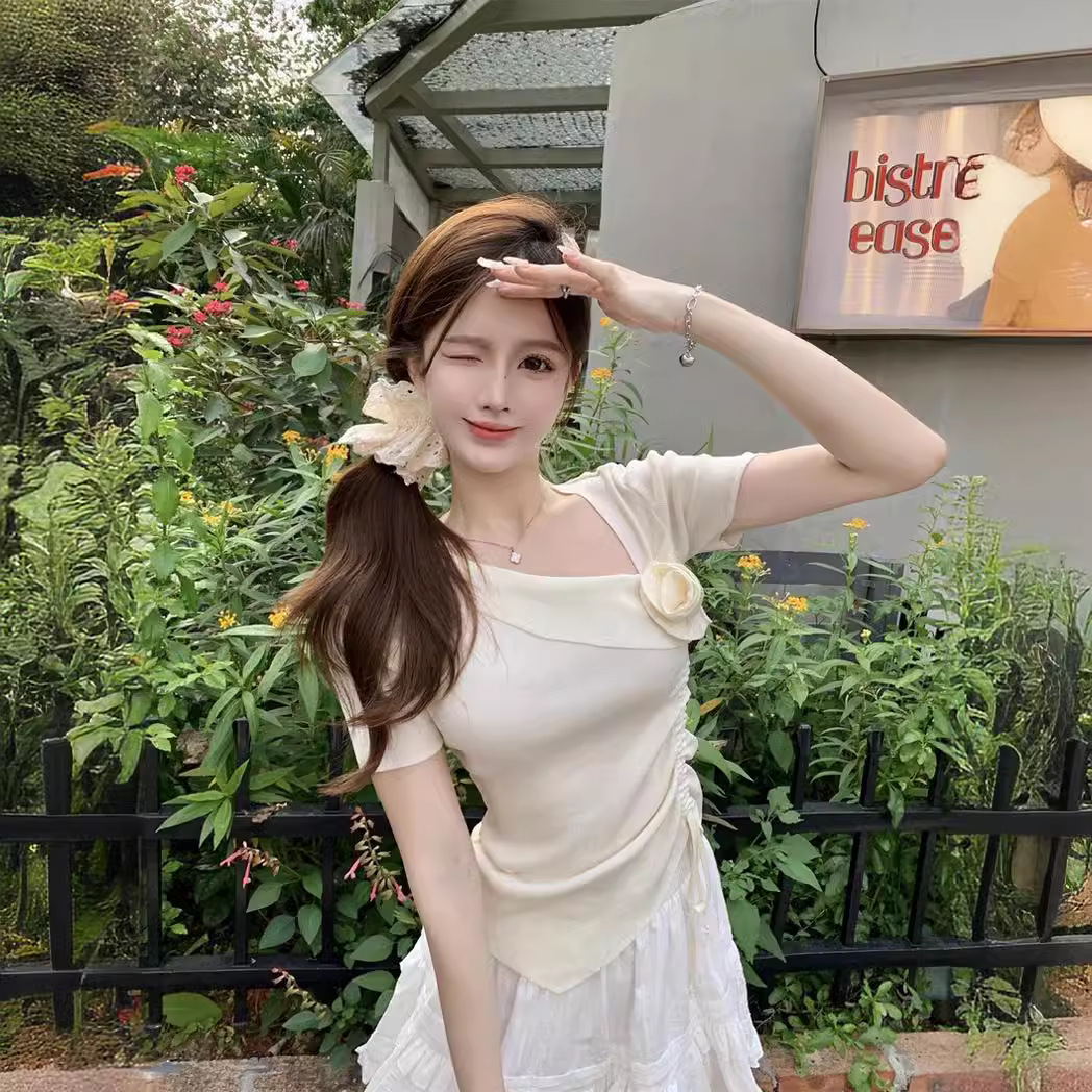 立体花朵斜领短袖T恤女夏季新款纯欲风气质褶皱修身别致上衣