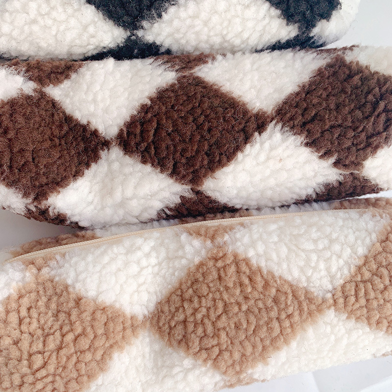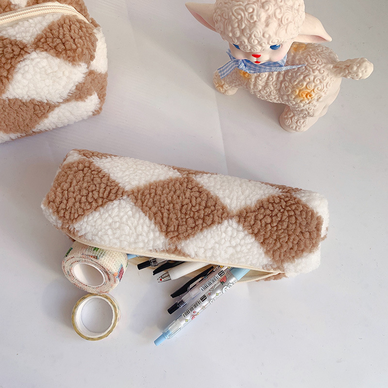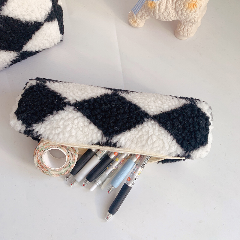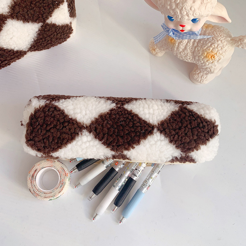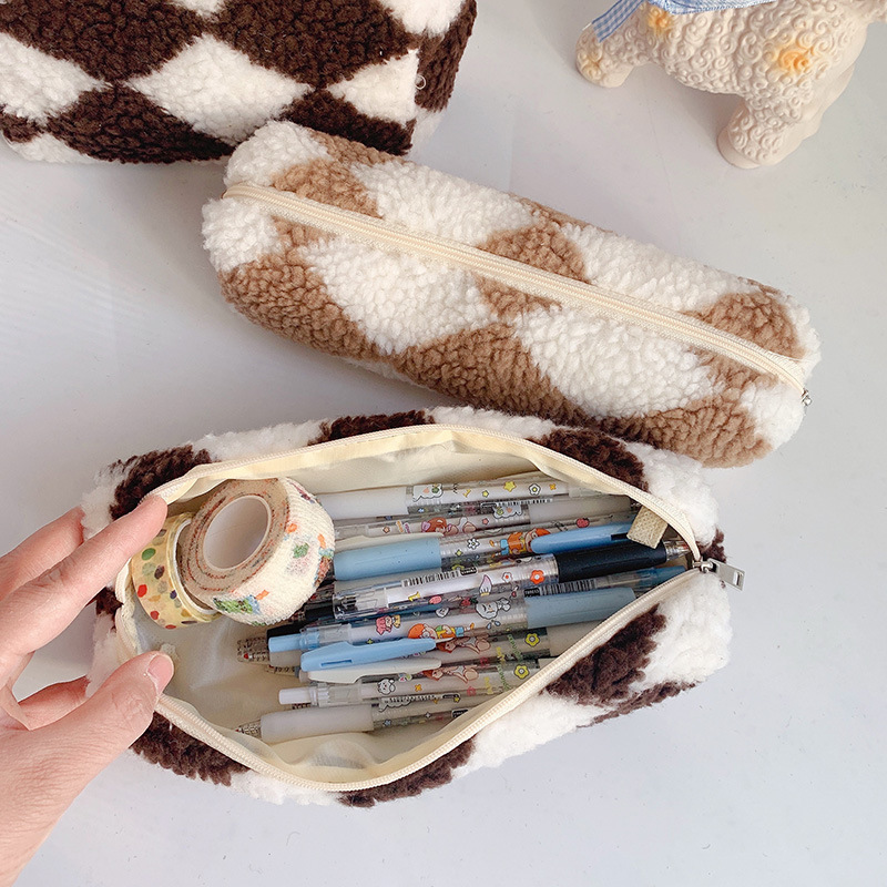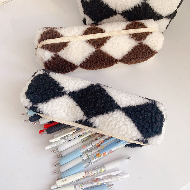 秋冬棋盘格子毛绒笔袋学生文具袋大容量收纳包菱格便携式文具盒