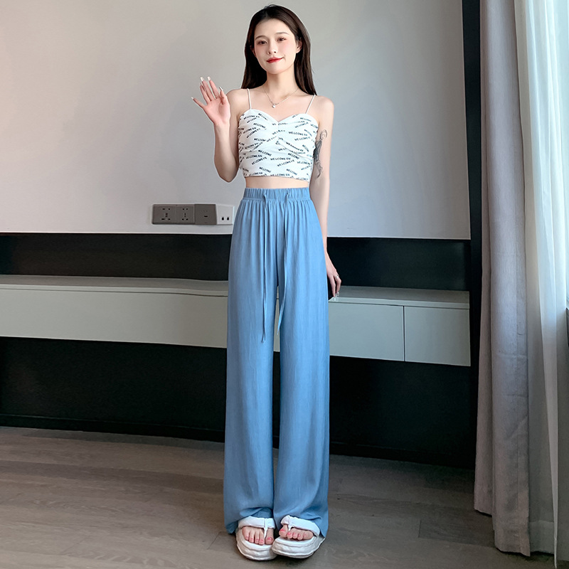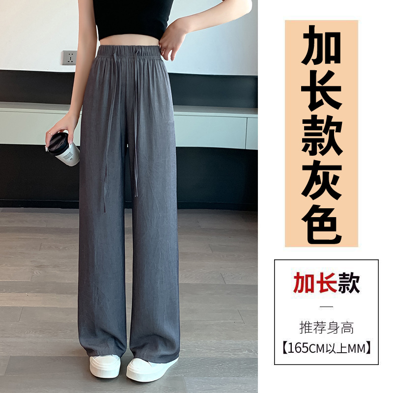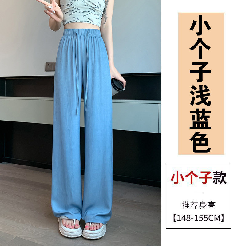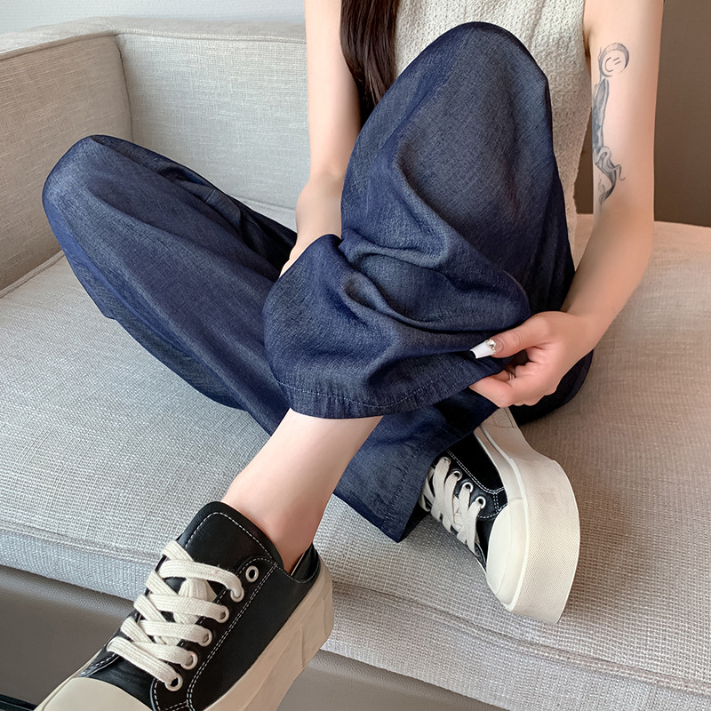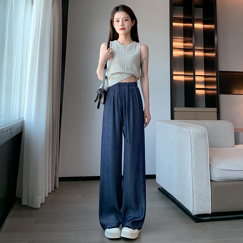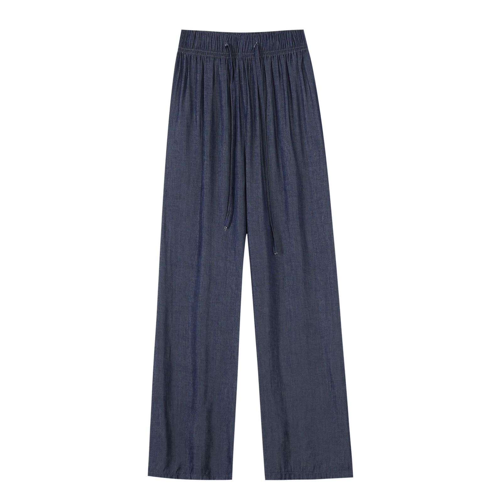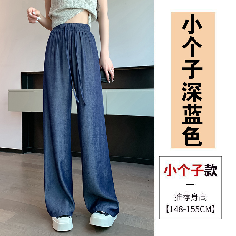深蓝色天丝牛仔裤女夏季薄款松紧高腰直筒宽松垂感凉凉冰丝阔腿裤