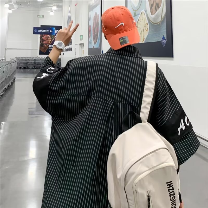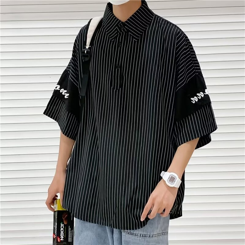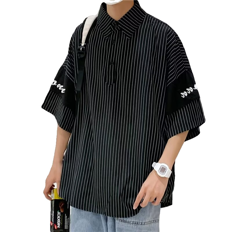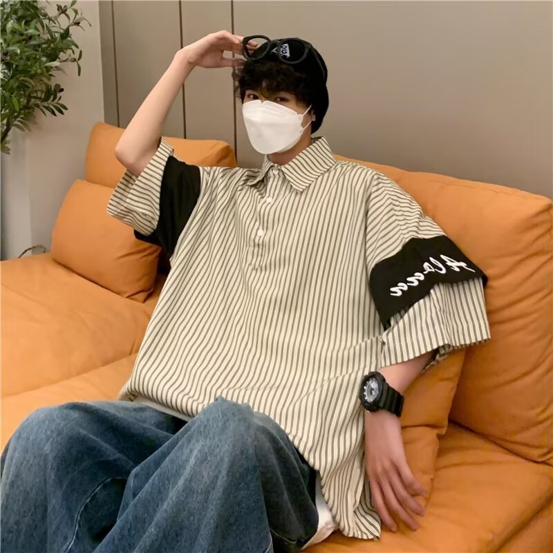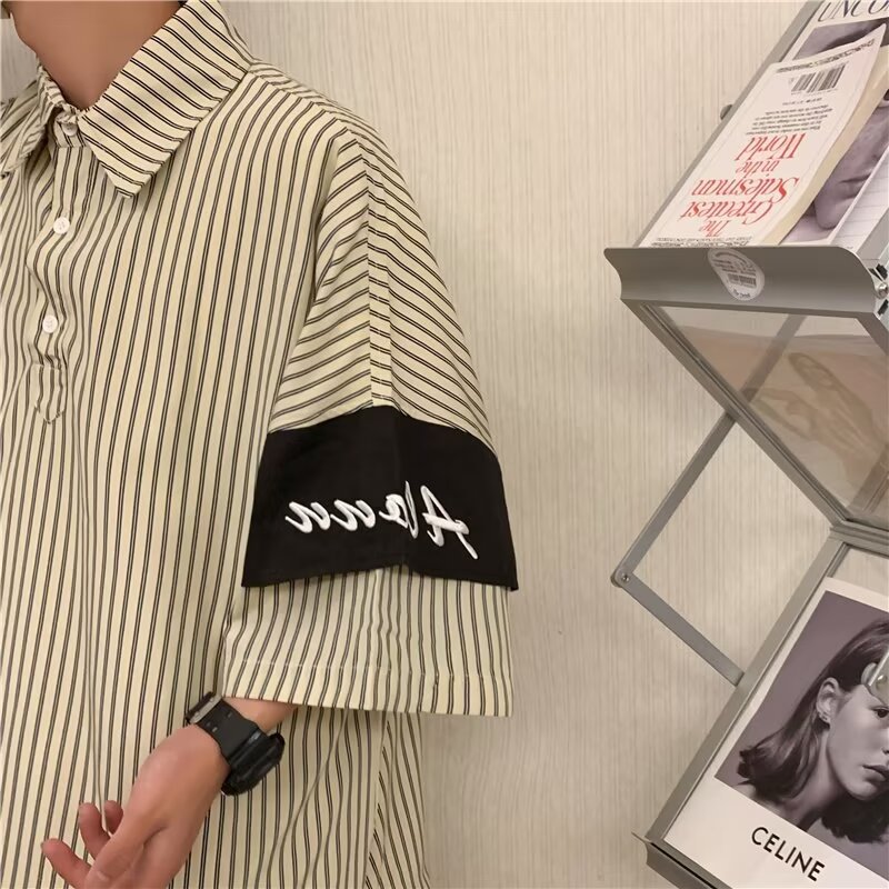 同款短袖条纹衬衫男夏季港风简约轻奢设计感潮牌拼接情侣潮流穿搭