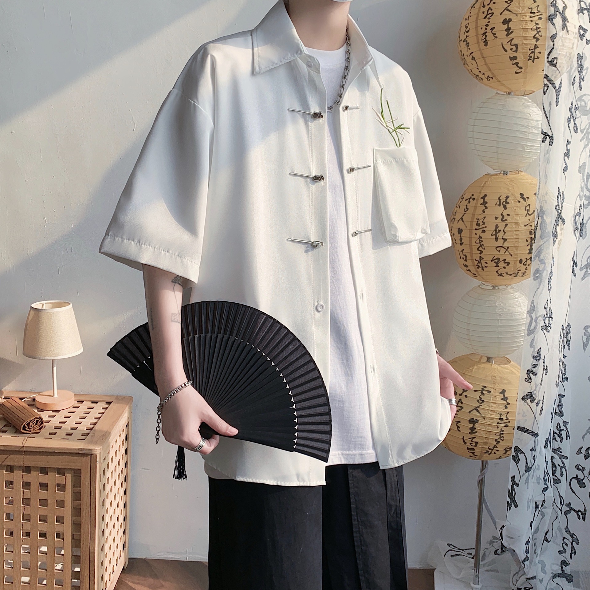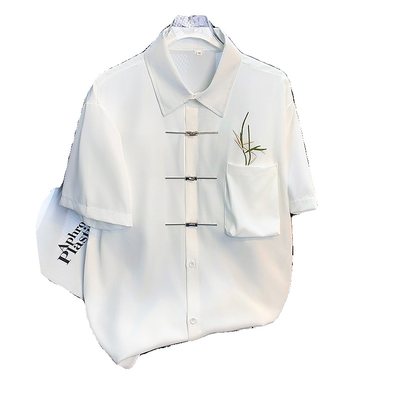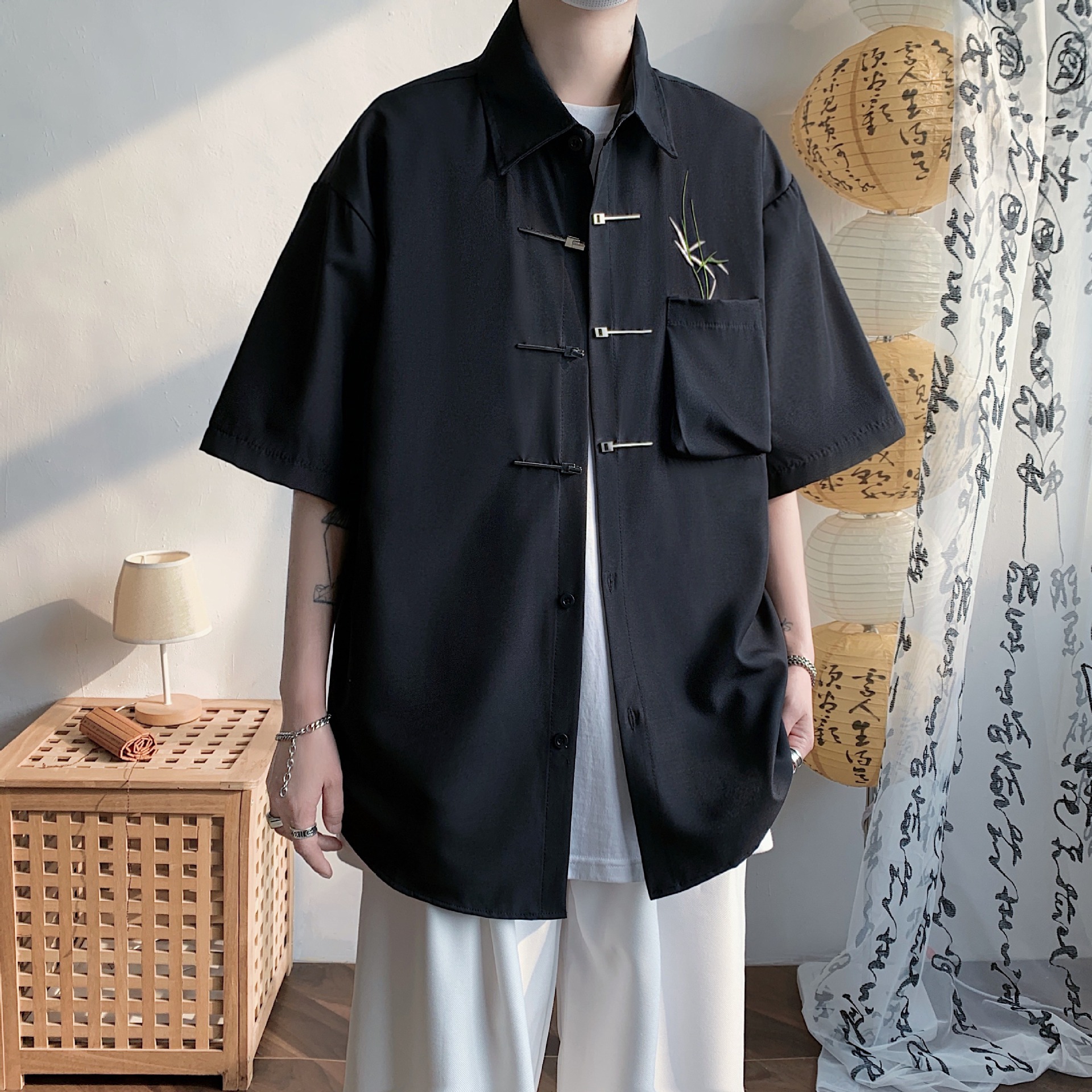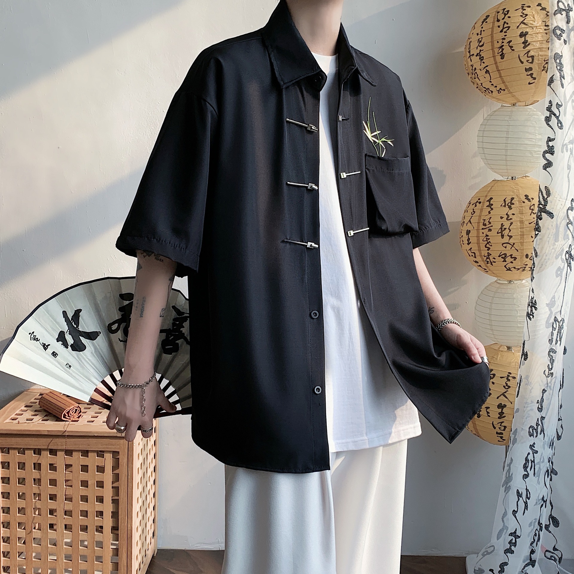 同款国风新中式翠竹刺绣金属飞机扣宽松慵懒衬衫男女夏季垂感宽松