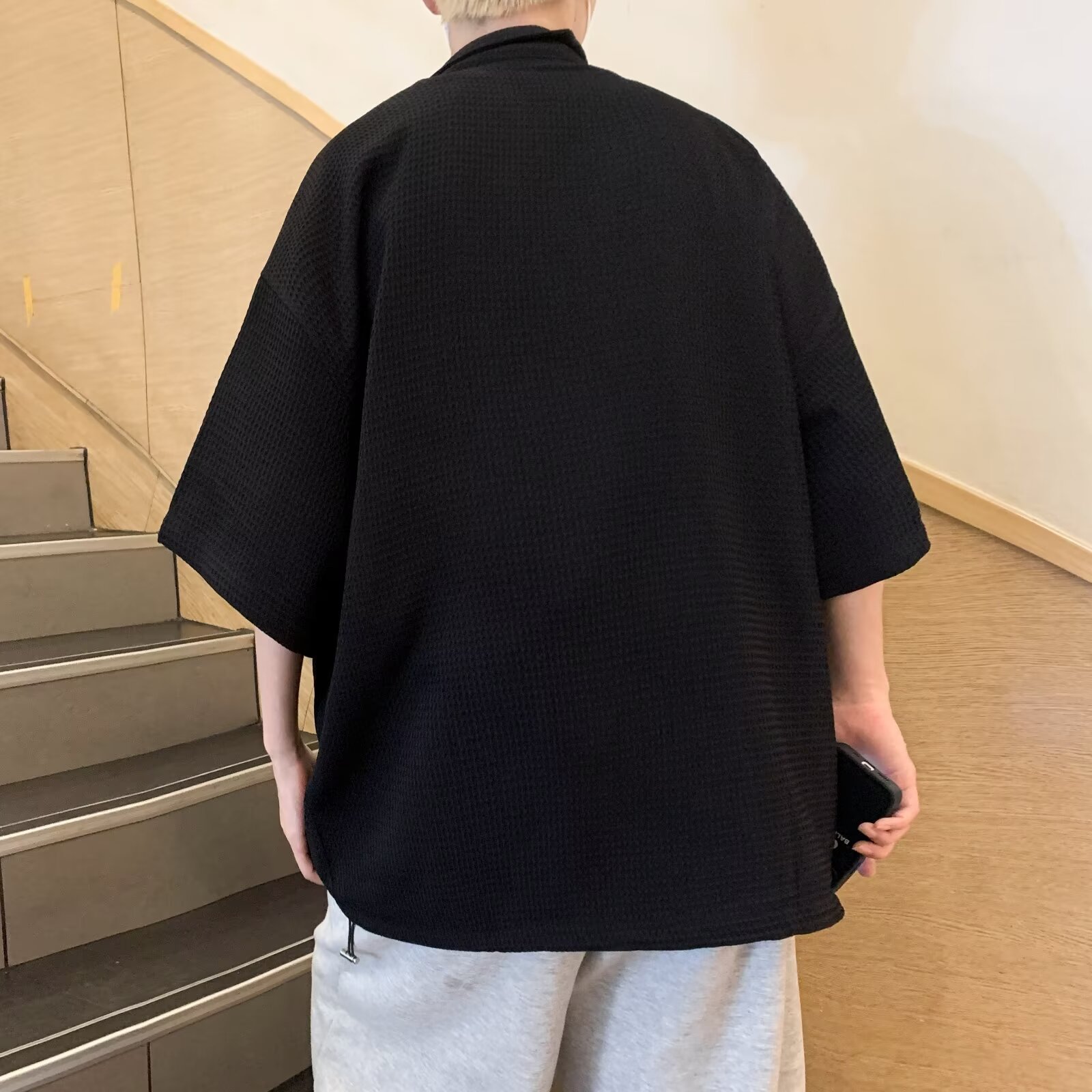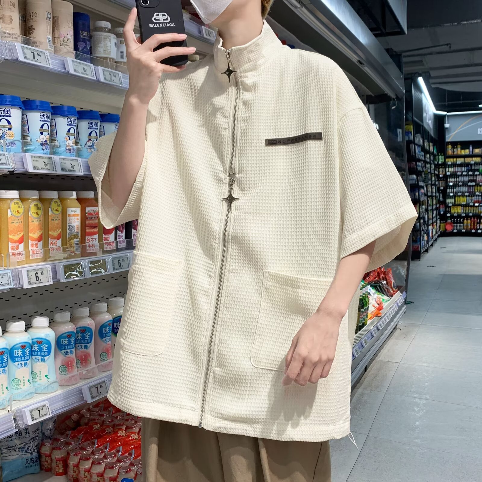 同款华夫格小众设计感双拉链短袖衬衫男夏季休闲百搭立领衬衣