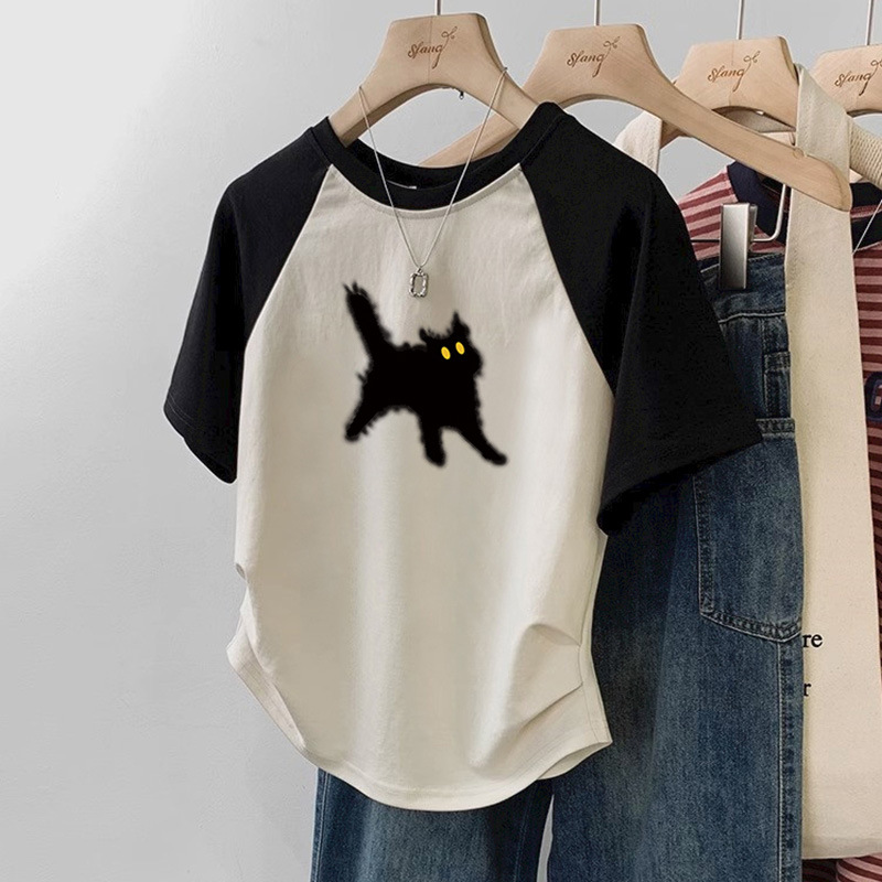 短袖女正肩T恤夏季新款显瘦宽松插肩袖短款撞色卡通上衣ins潮