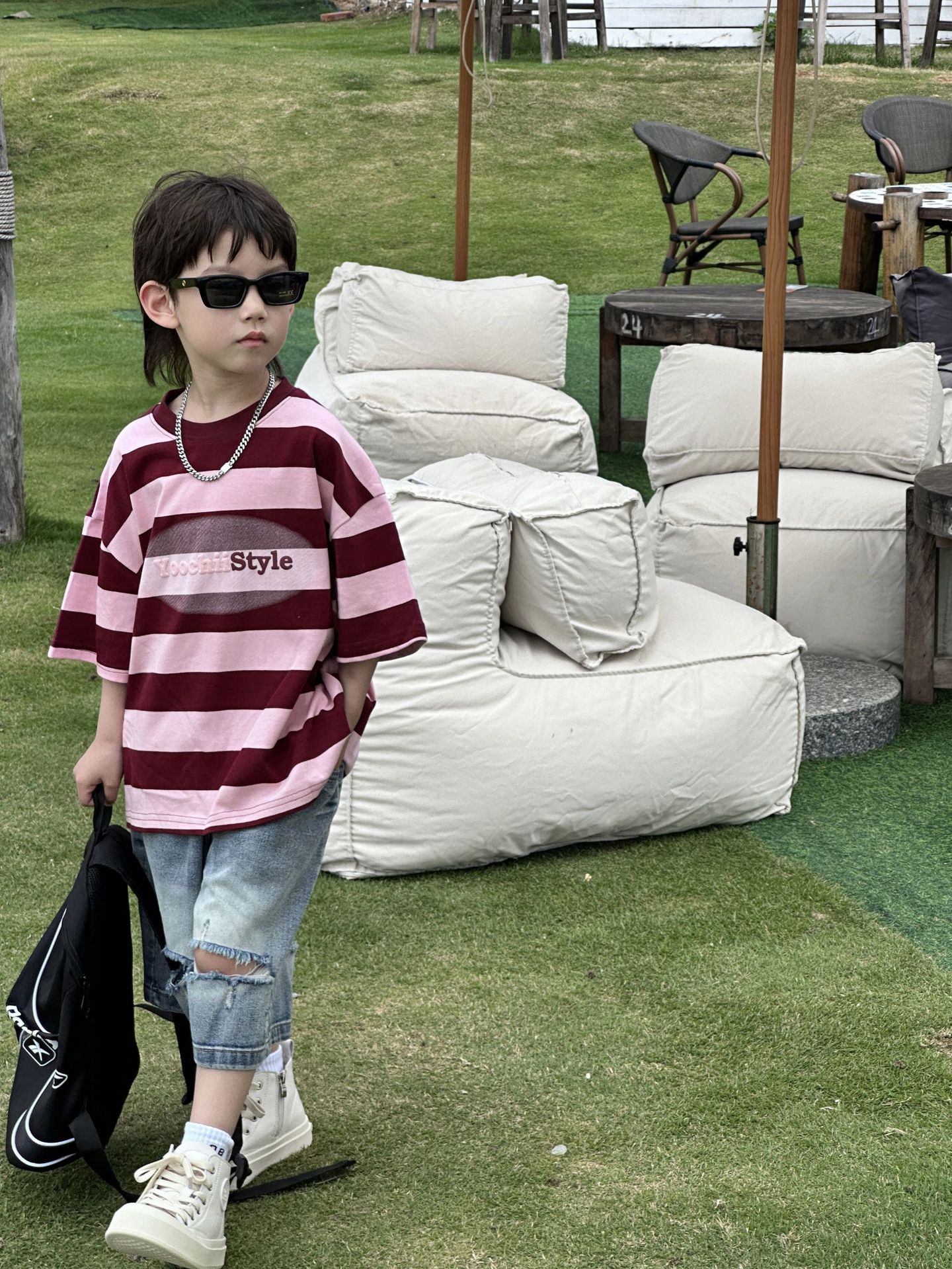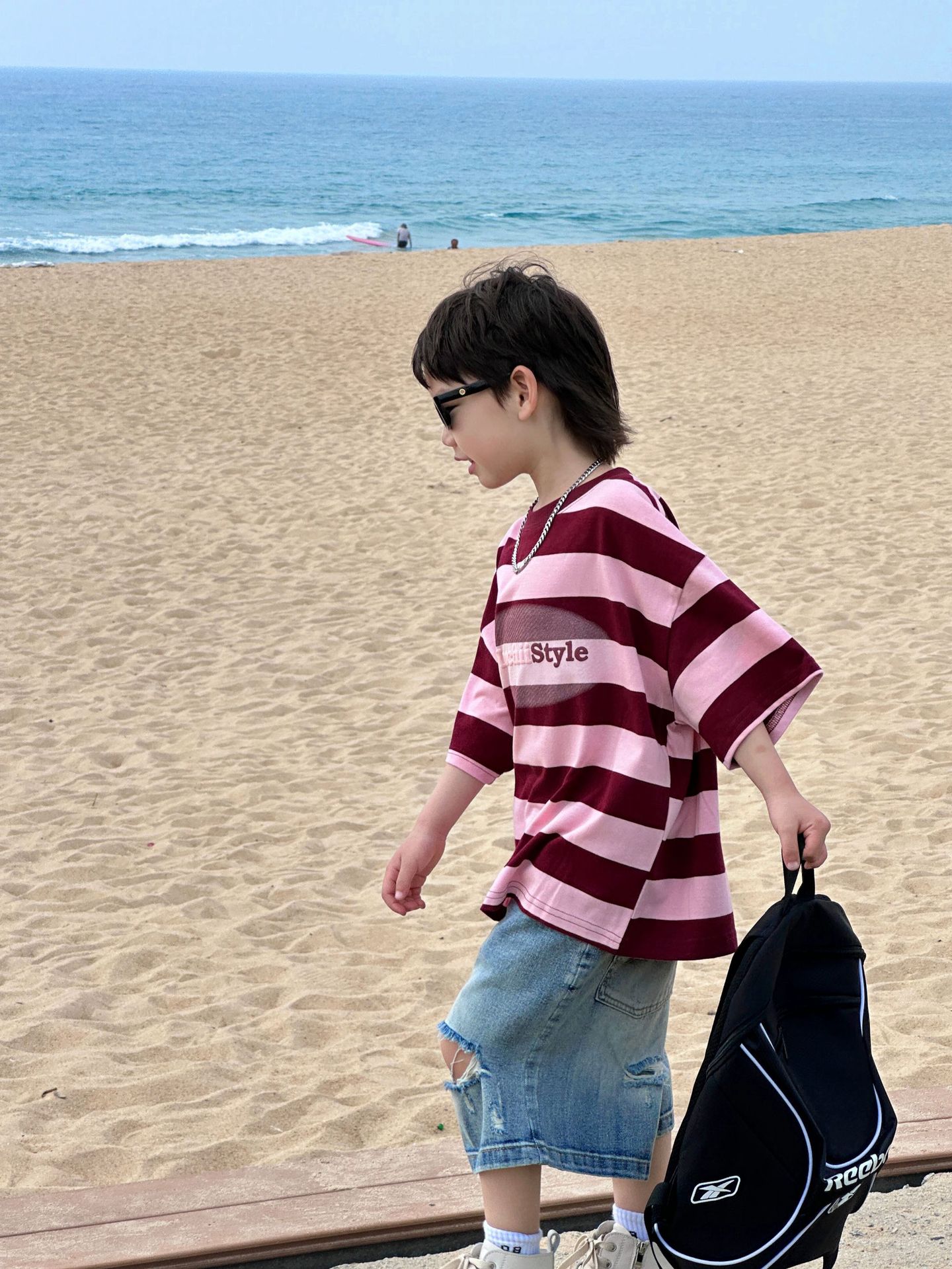 泰如夏季新款韩版男童时尚条纹字母洋气上衣T恤儿童短袖潮