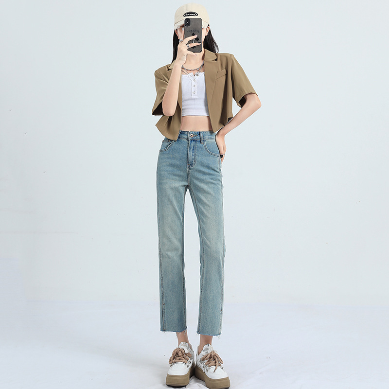 春夏新款高腰法棍烟管直筒牛仔裤女显瘦修身 九分小个子烟管裤