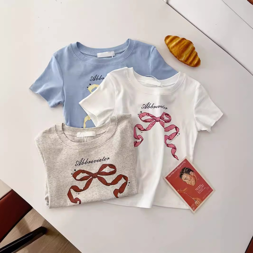 蝴蝶结小众甜美夏季印花紧身短袖T恤小个子修身新款短款上衣