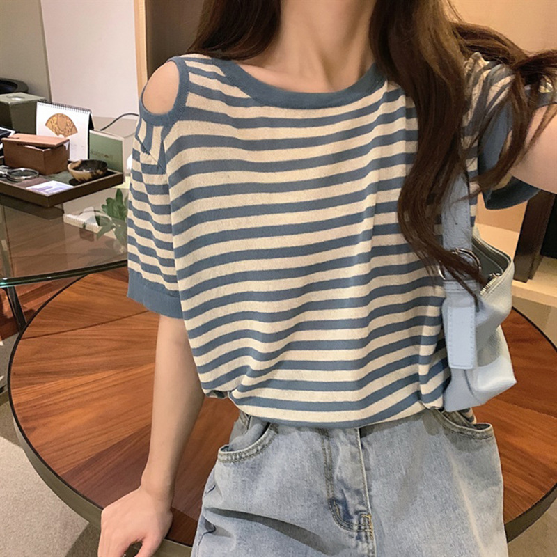冰丝针织衫条纹短袖t恤女夏季新款宽松露肩半袖体桖设计感上衣服