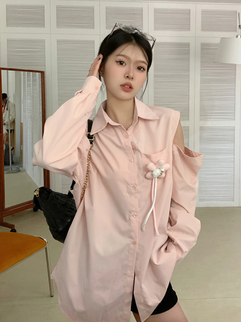 高级感粉色衬衫气质温柔风长袖开衫别致设计感露肩百搭春秋外套女
