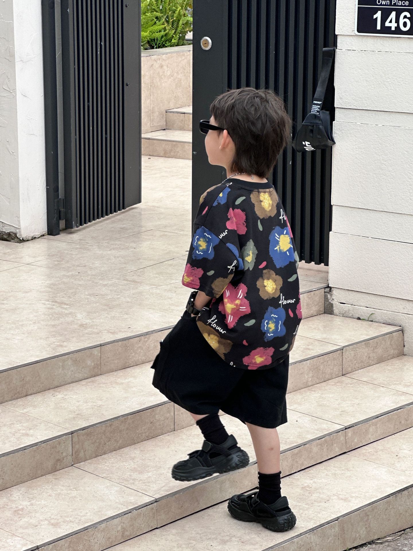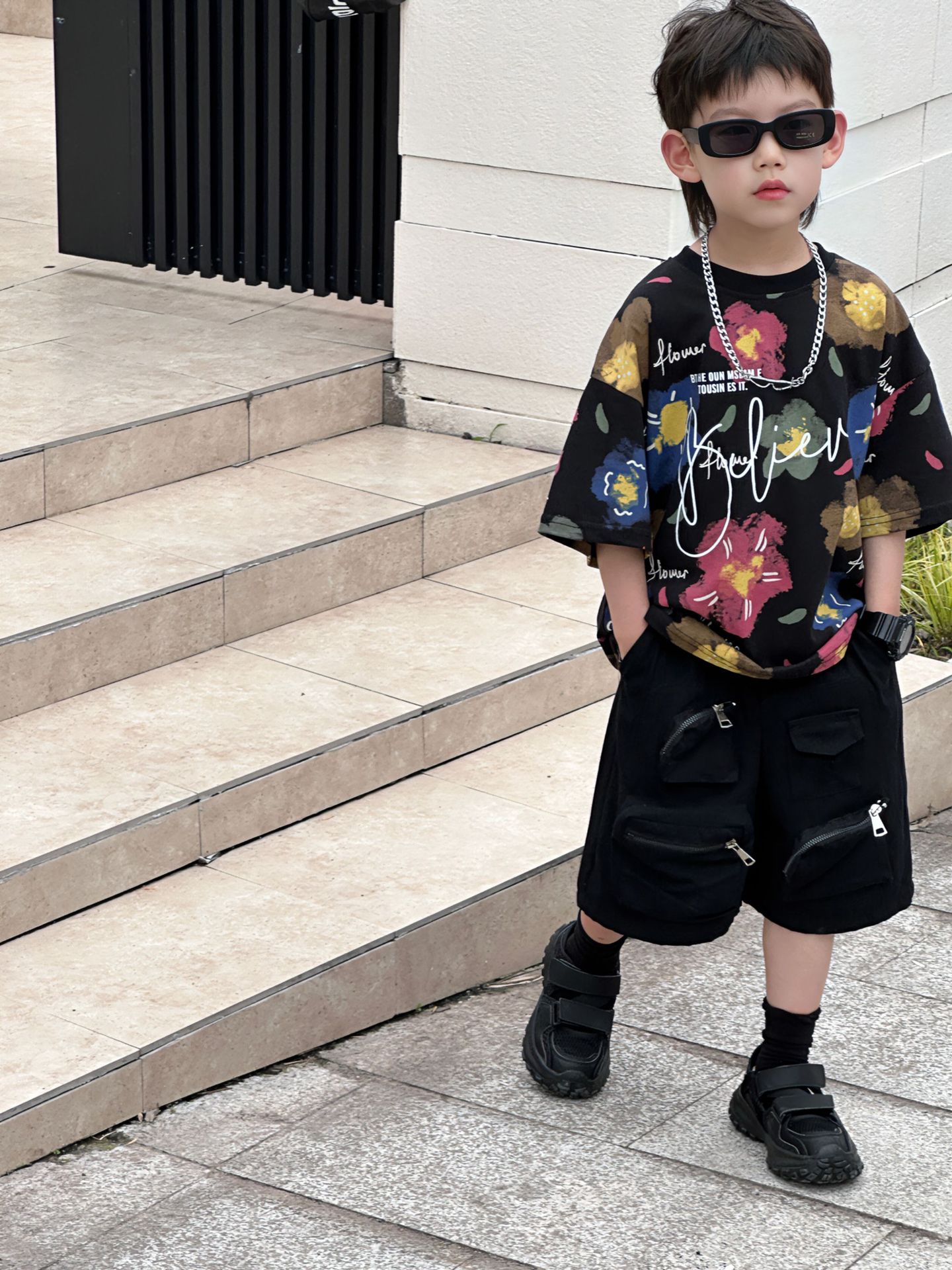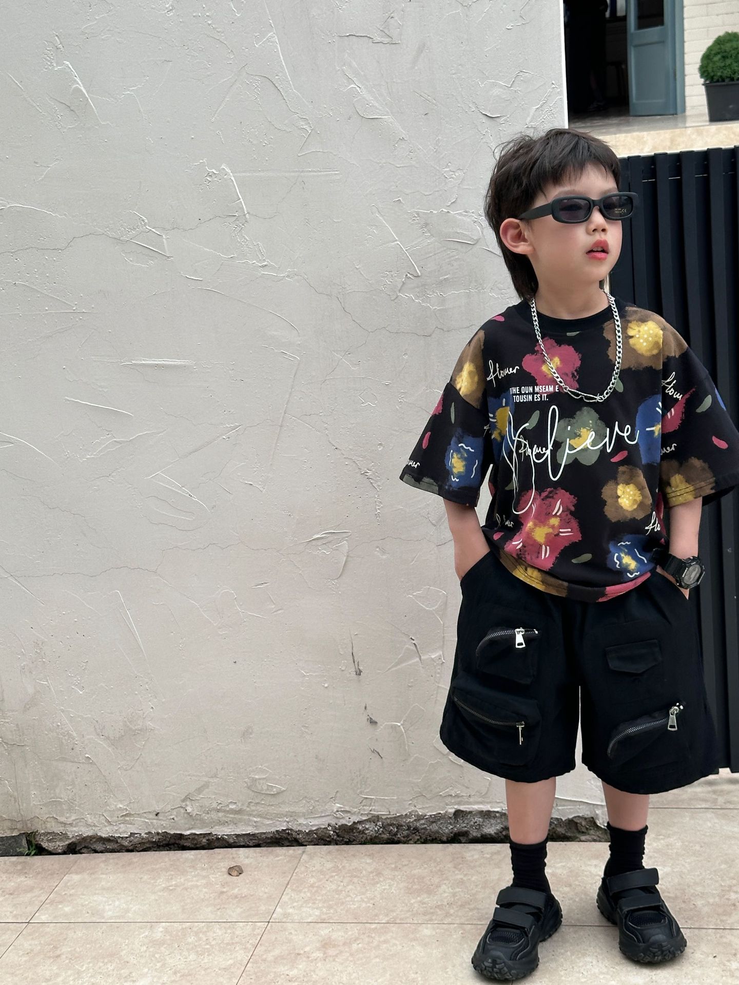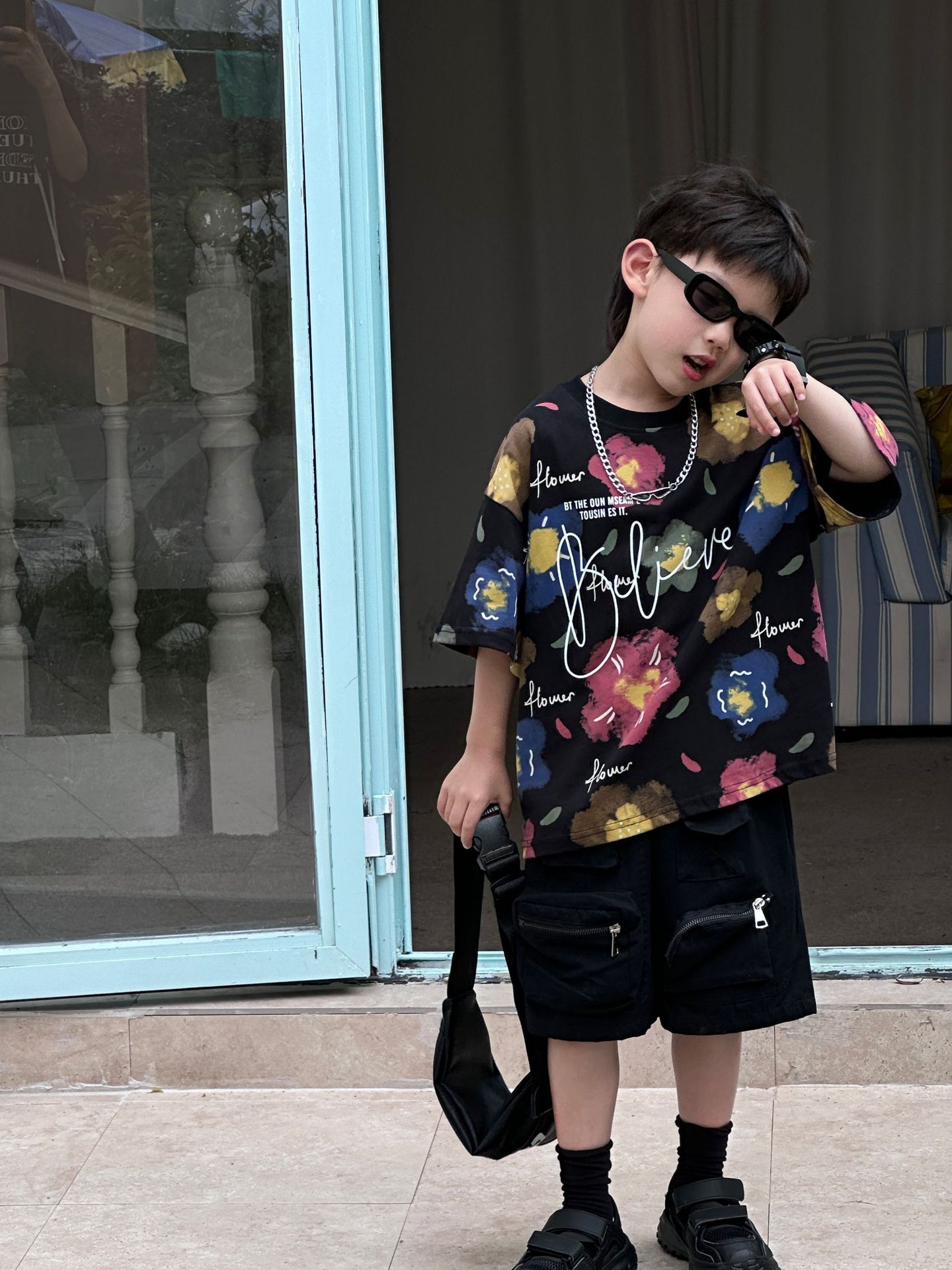 泰如夏季新款韩版男童百搭设计感花朵潮酷T恤儿童短袖上衣