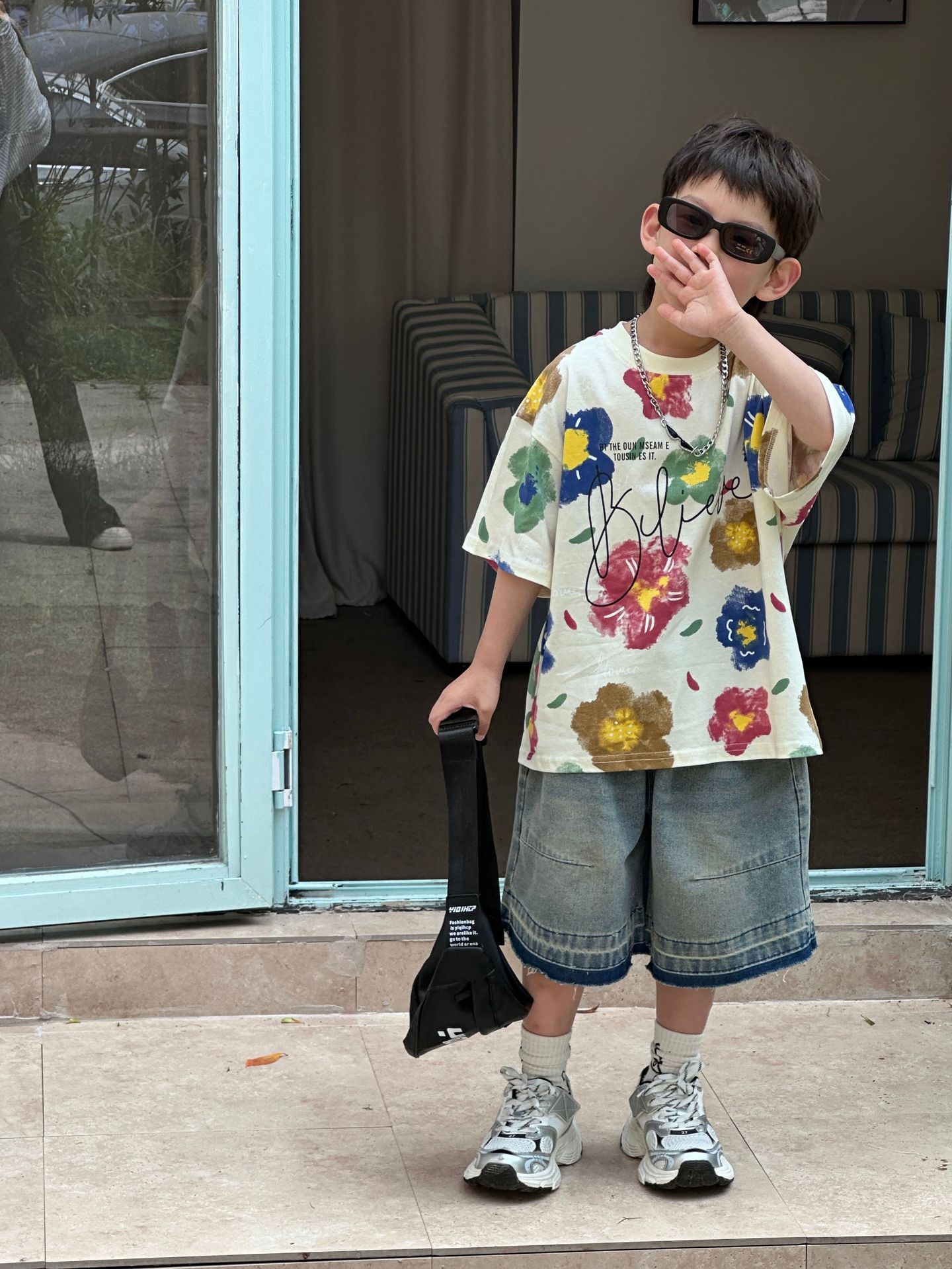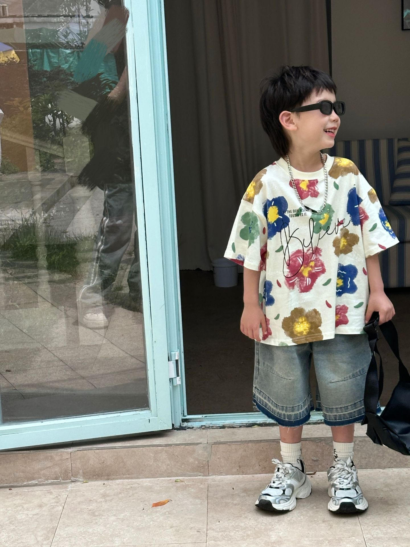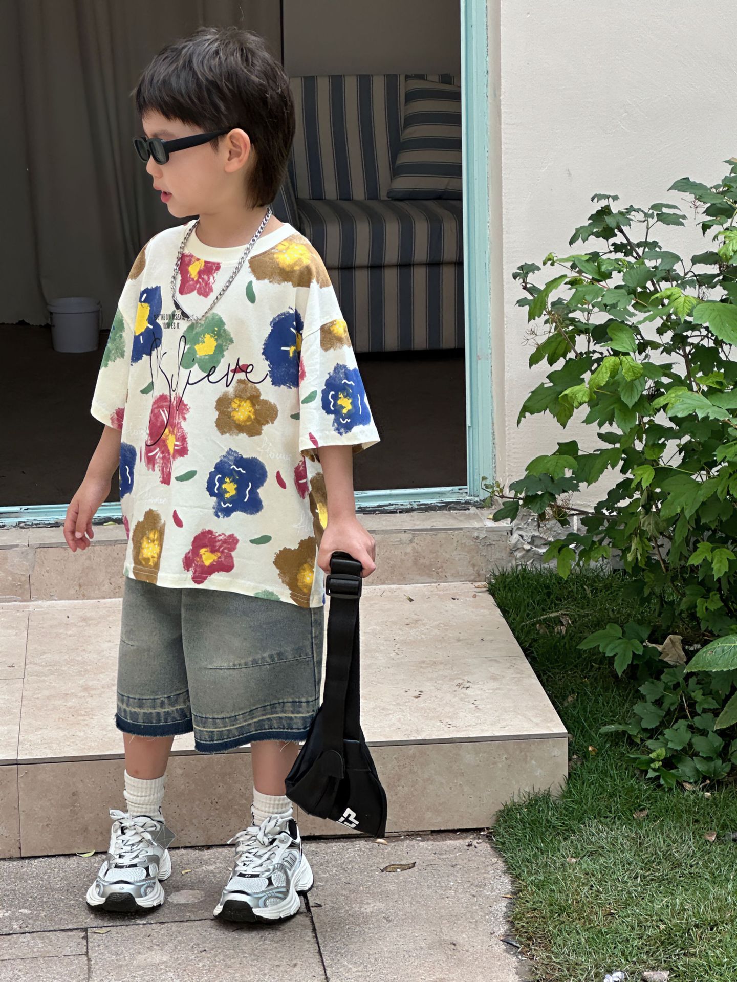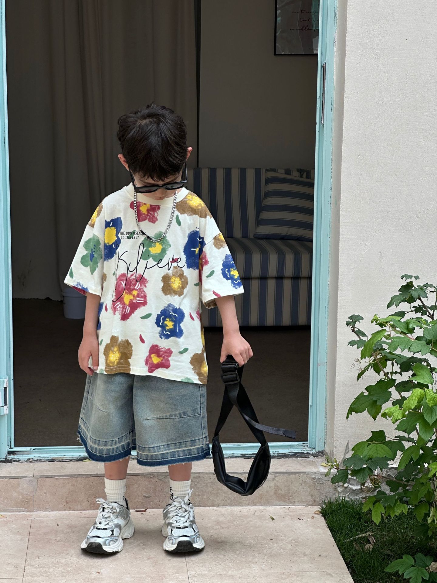 泰如夏季新款韩版男童百搭设计感花朵潮酷T恤儿童短袖上衣