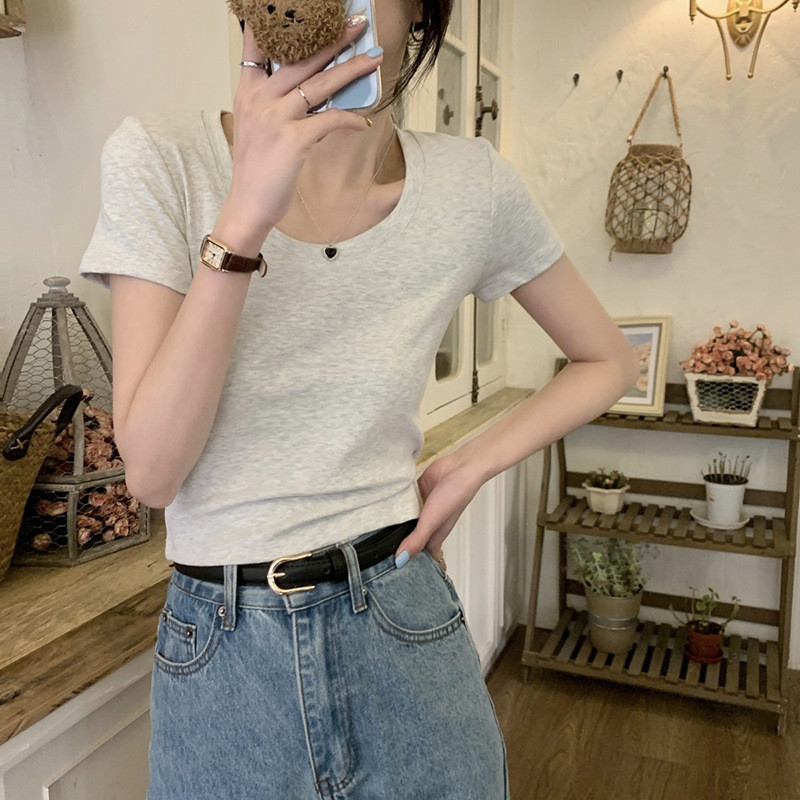 纯欲风修身短袖T恤女夏季基础款U领灰色圆领体桖百搭显瘦短款上衣