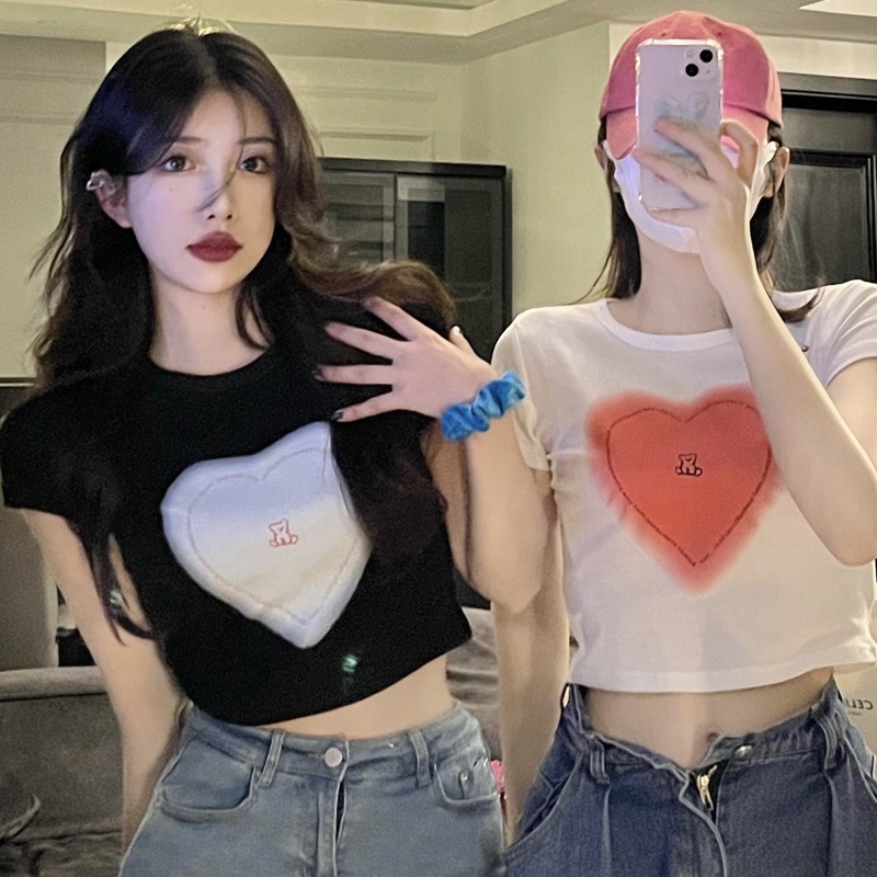短袖t恤女ins潮夏季设计感甜辣妹爱心高腰露脐短款学生上衣女