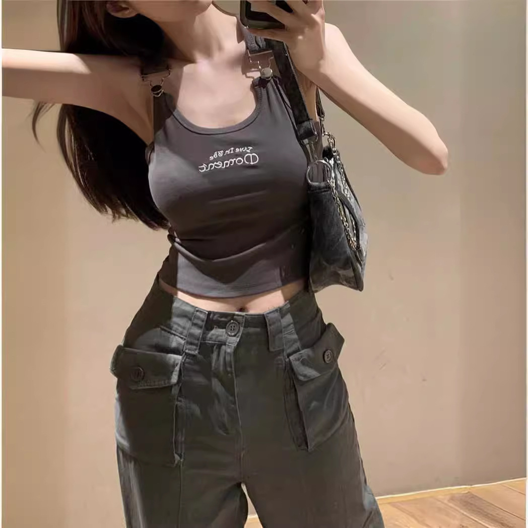 美式纯欲风高腰罗纹字母刺绣吊带背心女春季辣妹外穿短款无袖上衣