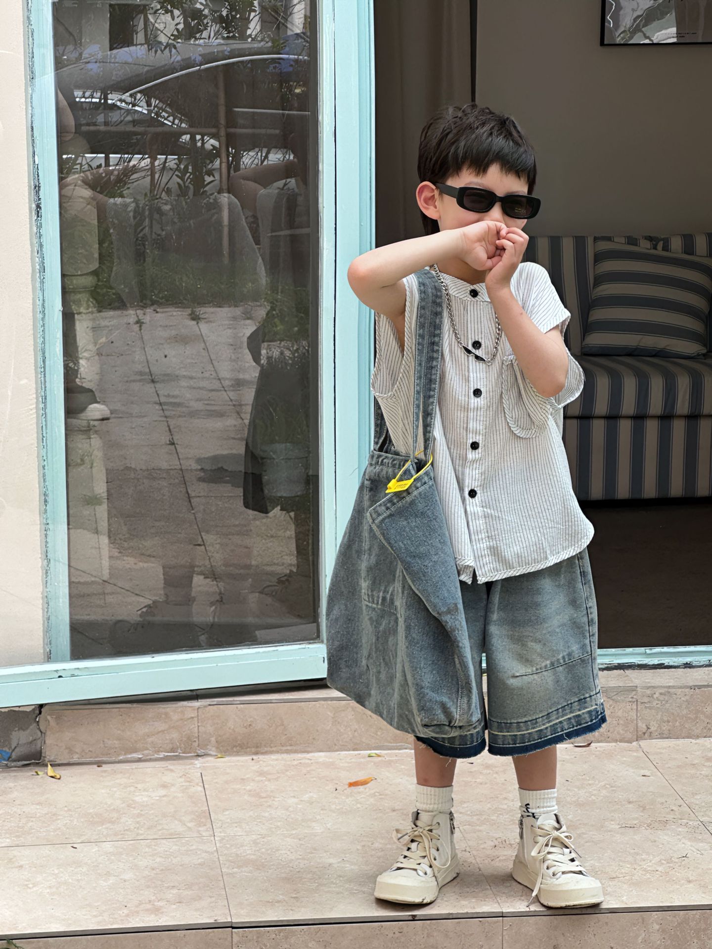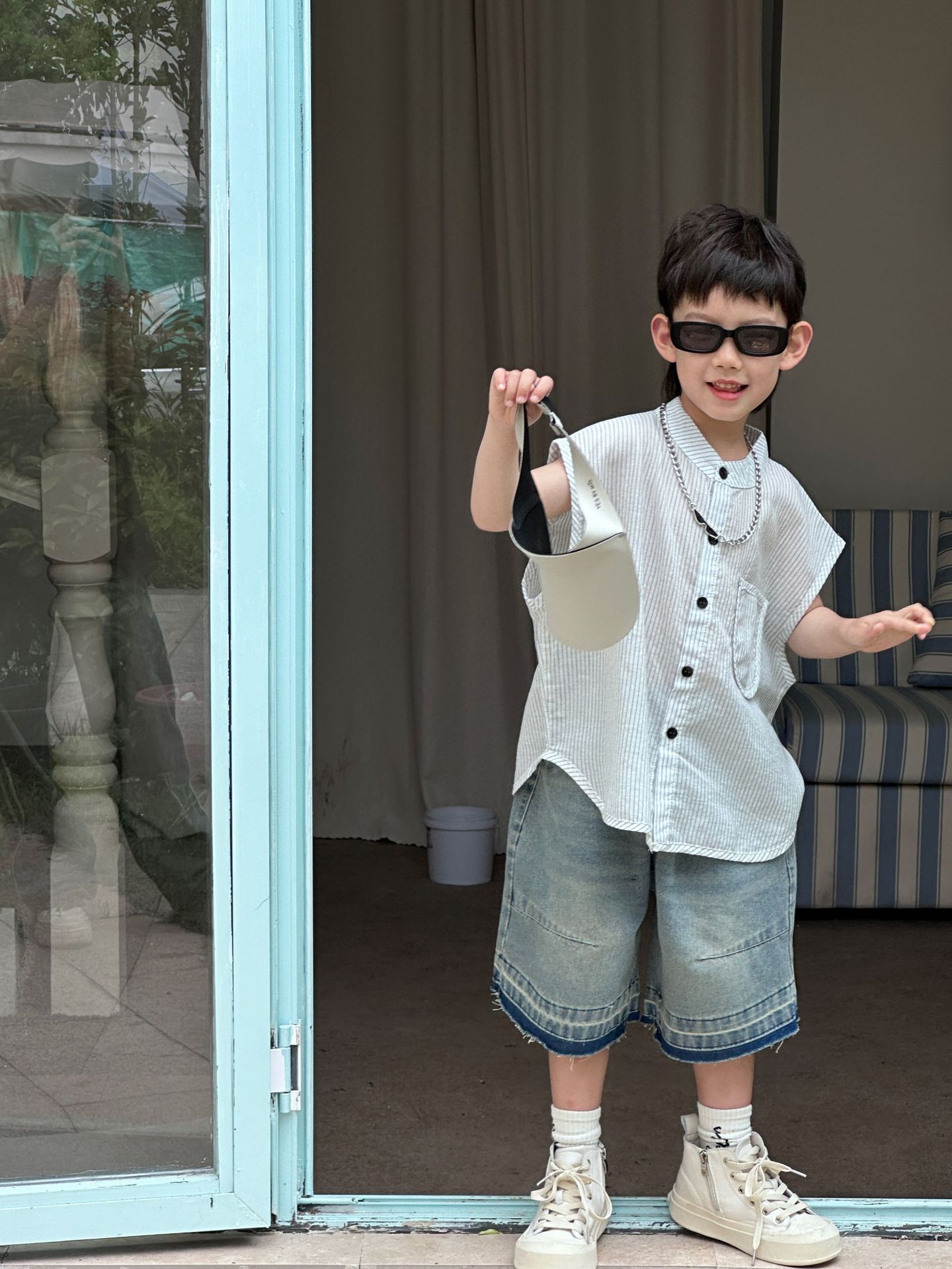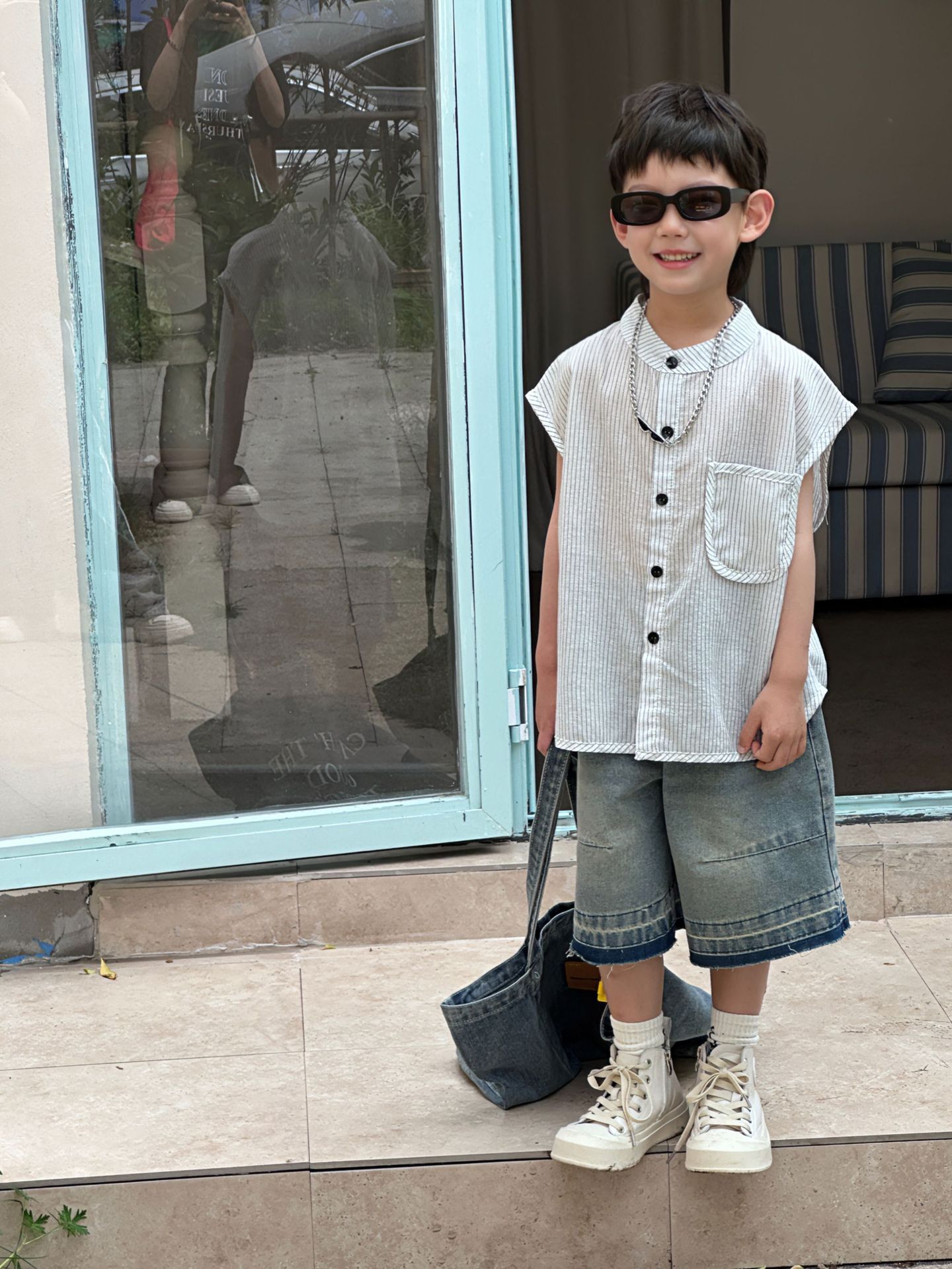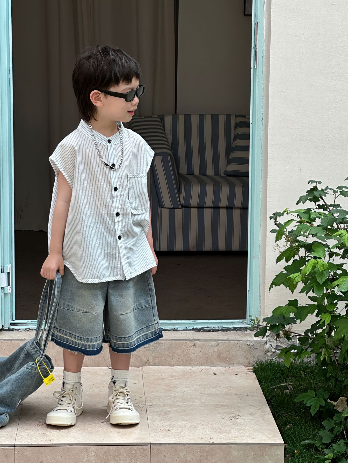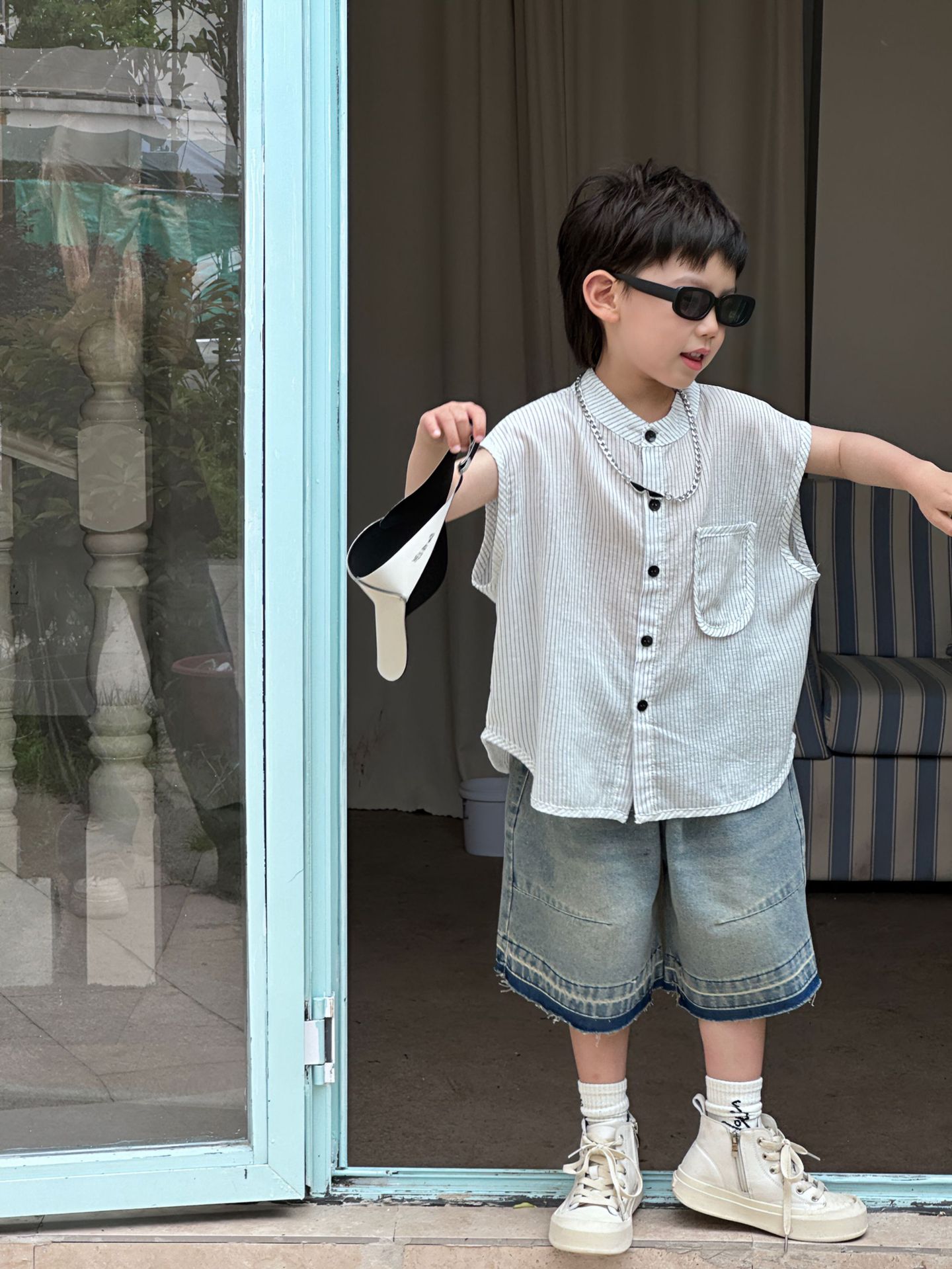 泰如夏季新款韩版男童设计感百搭竖条纹无袖衬衫儿童上衣潮