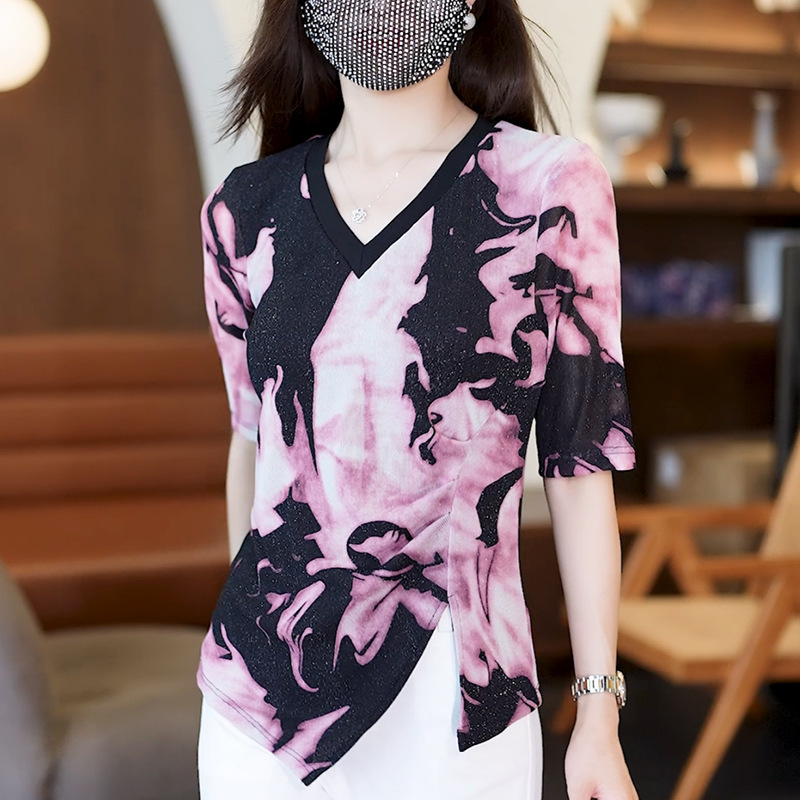 亮丝V领印花上衣女五分袖妈妈装夏季女装宽松开叉网纱小衫夏