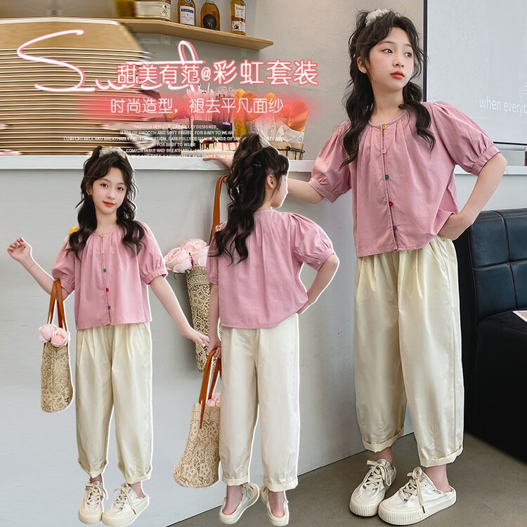 女童韩版夏装套装中大童夏季新款洋气泡泡袖上衣时髦束脚裤两件套