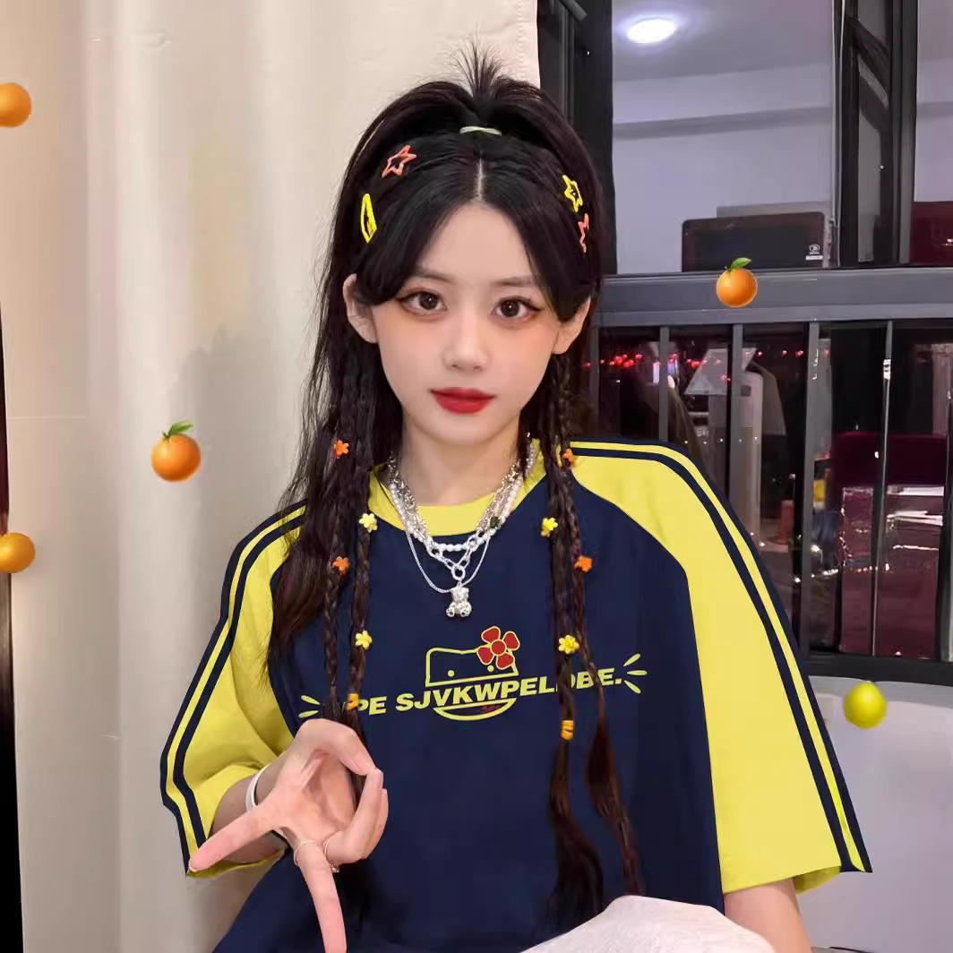 三条杠美式潮牌短袖t恤女撞色插肩小众设计感夏季宽松半袖上衣服