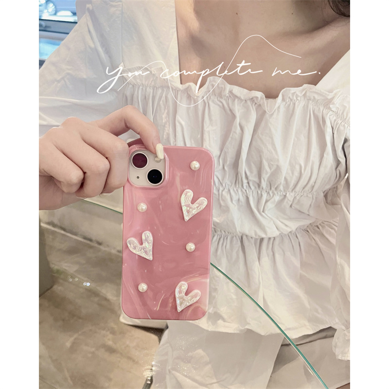 粉色晕染珍珠镭射爱心适用iPhone14promax手机壳苹果15全包13防摔