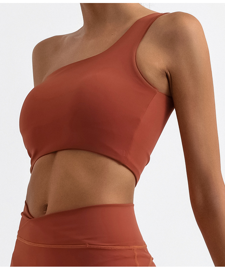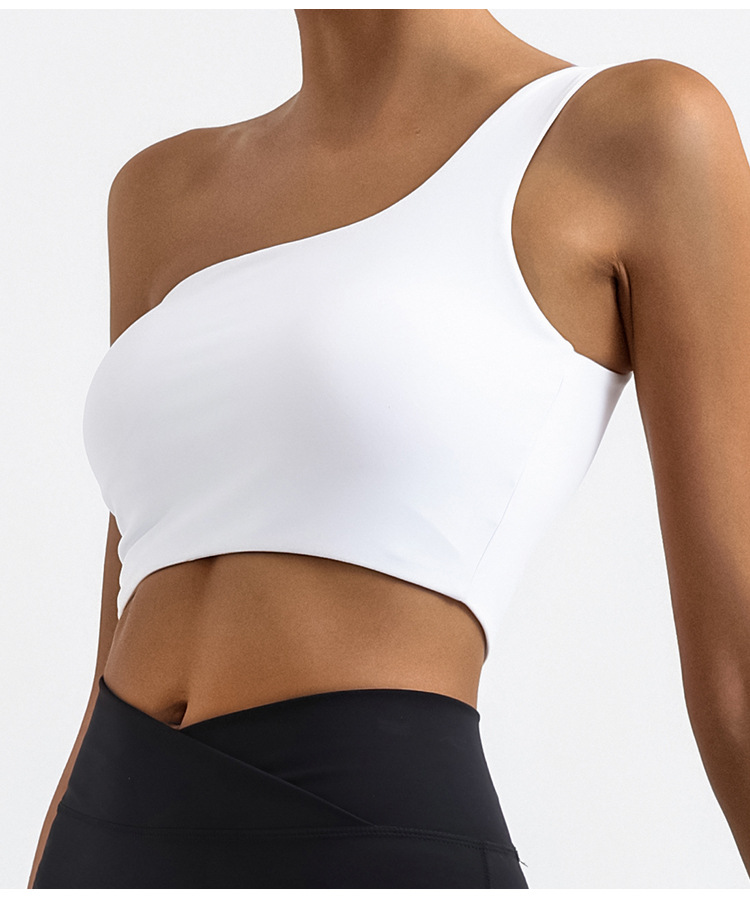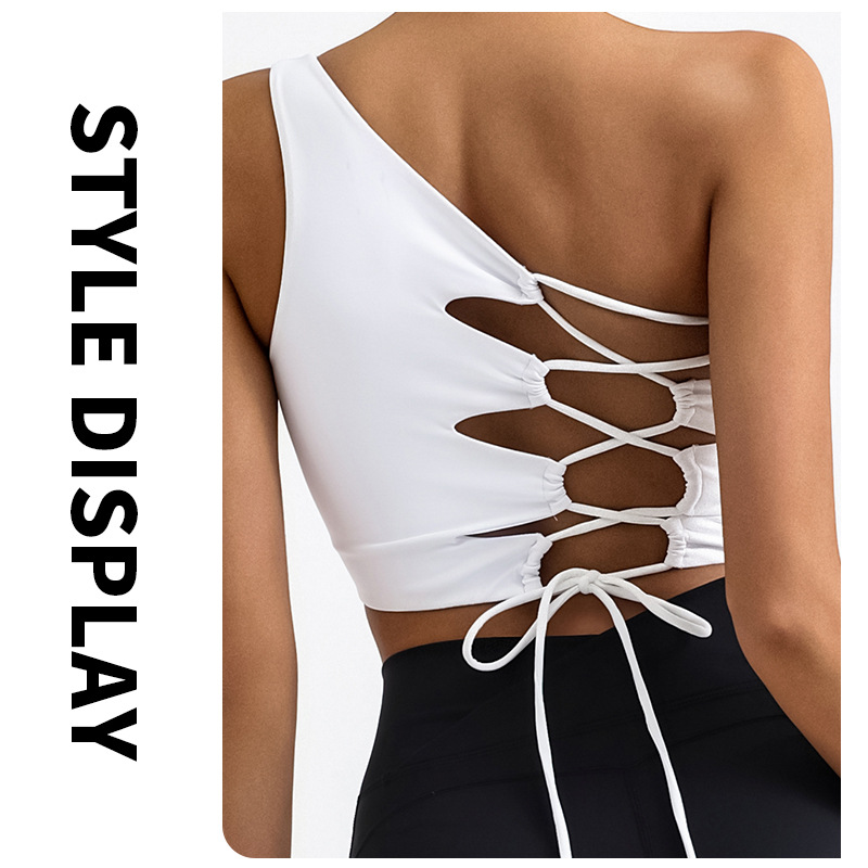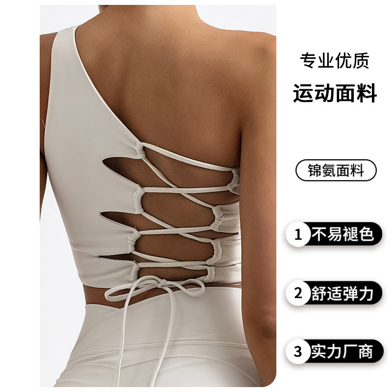 欧美外贸跨境瑜伽背心不规则单肩美背系带裸感含胸垫运动健身上衣