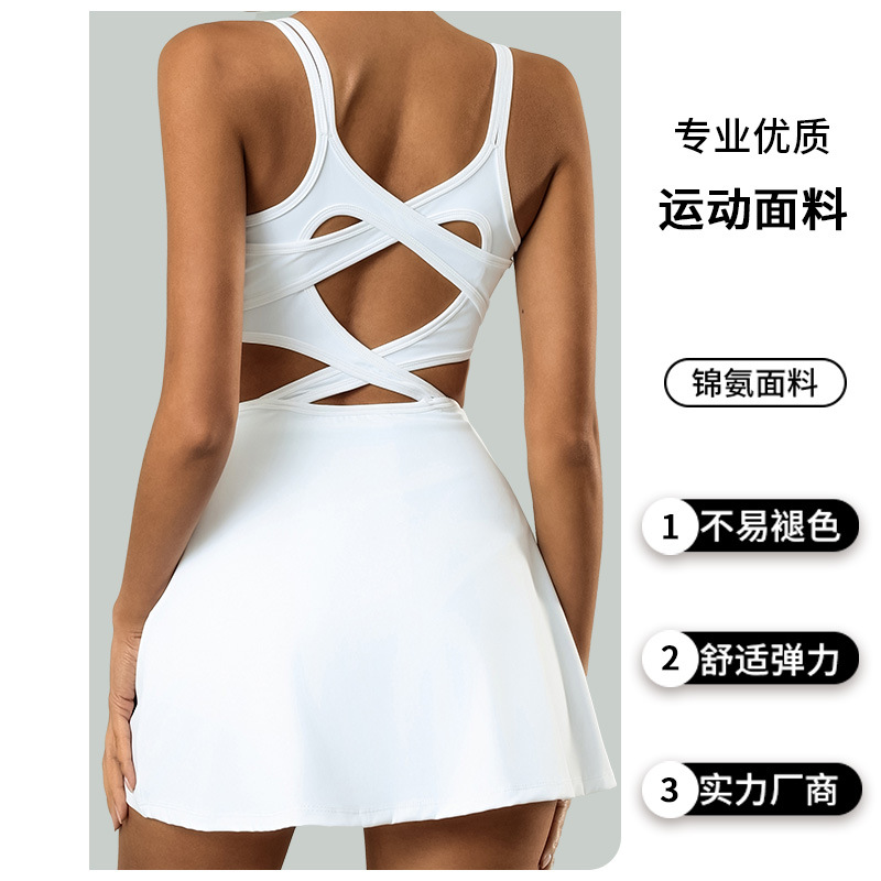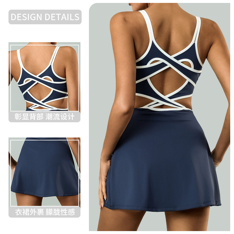 欧美跨境外贸运动连体裙女 含胸垫高弹速干美背交叉防走光网球裙