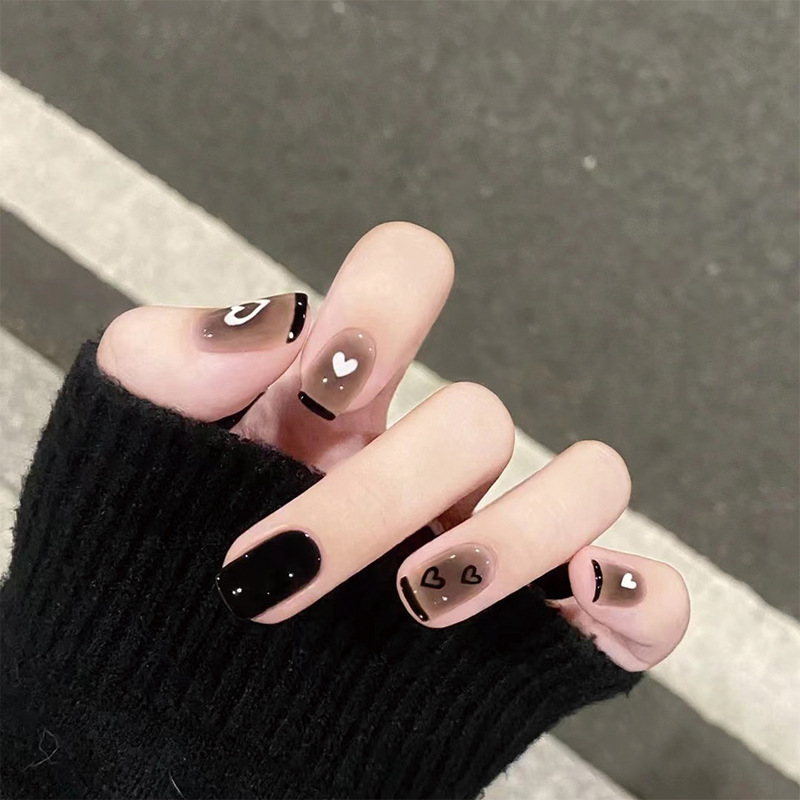 美甲穿戴甲法式黑边黑色渐变白色小爱心穿戴甲甲片批发美甲片
