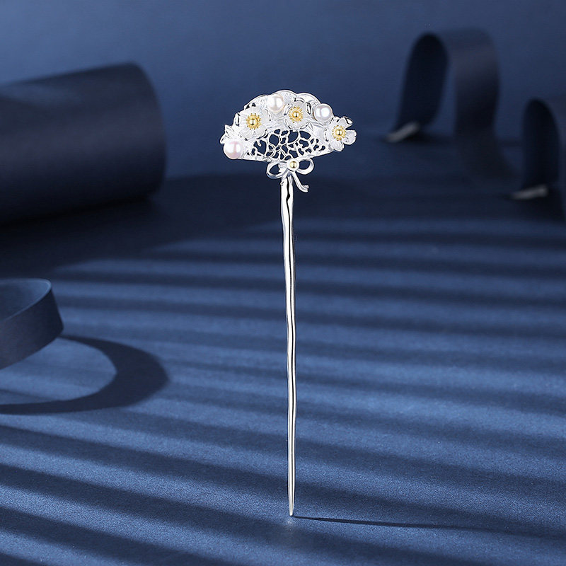 盘头的发簪女古风汉服盘发百搭电金分色珍珠扇形一字簪子