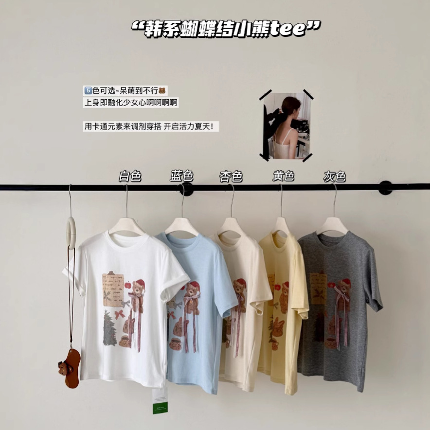 夏上新!Hers简约日常休闲小熊图案蝴蝶结宽松小众短袖T恤女