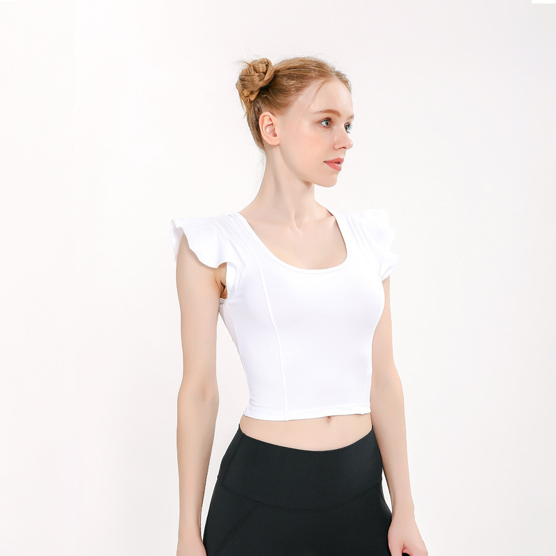 新款荷叶肩瑜伽上衣女 裸肤高弹运动罩衣训练健身吸湿速干T恤