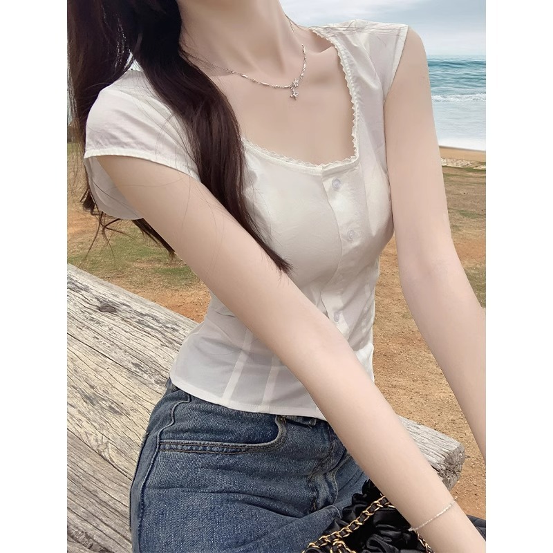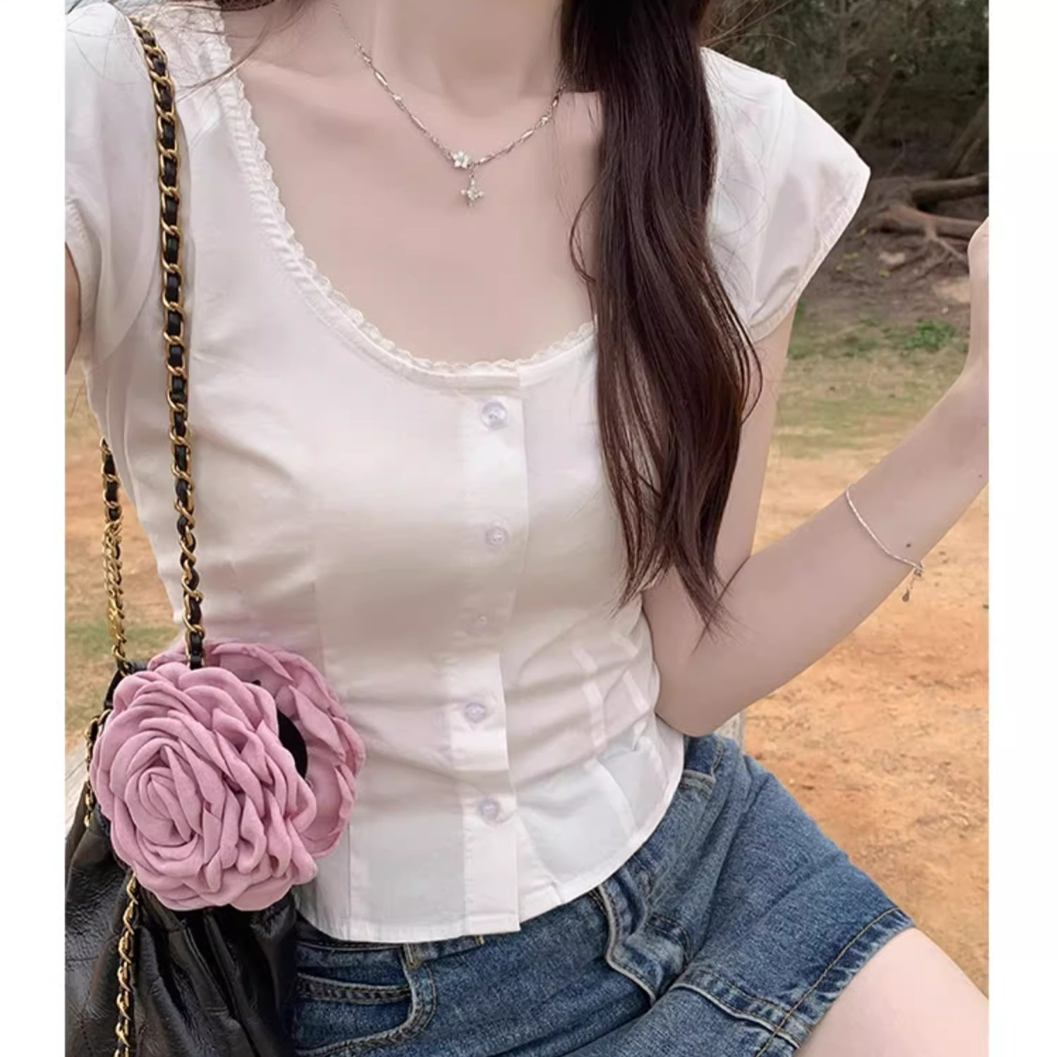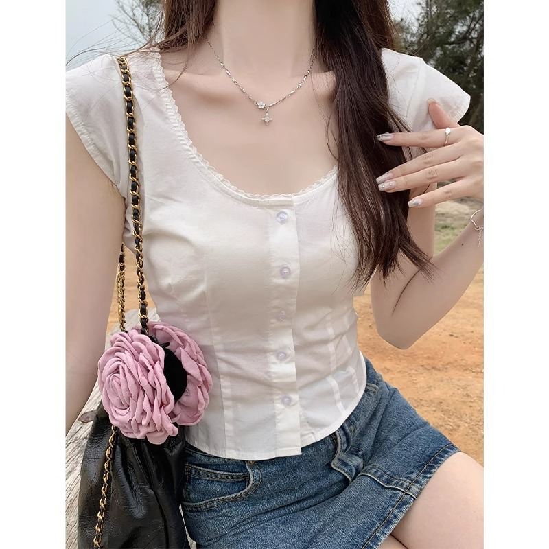 纯欲花边拼色低领露锁骨短袖开衫女甜辣妹紧身收腰短款t恤上衣夏