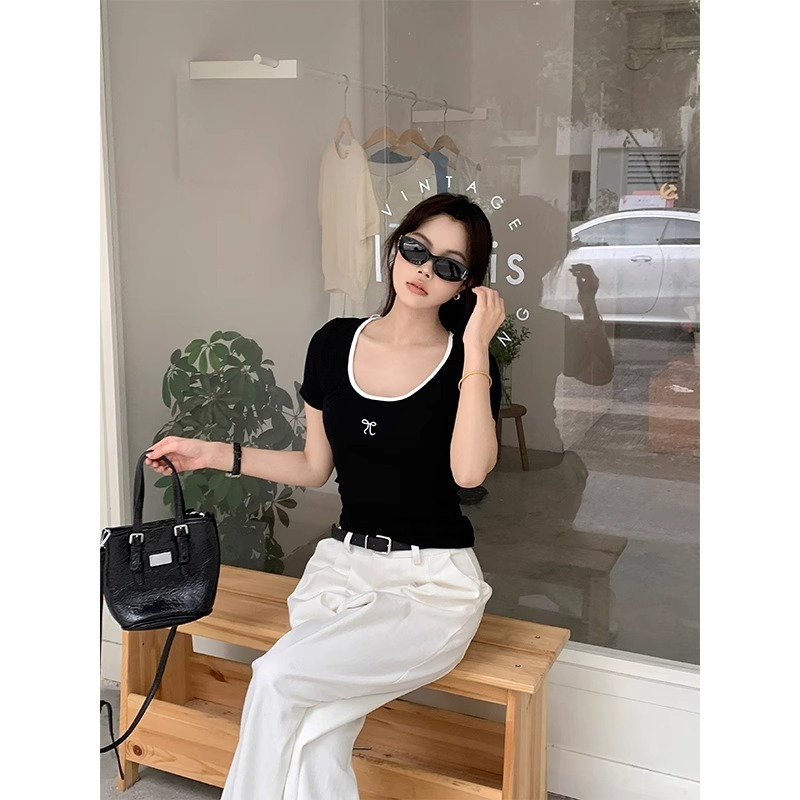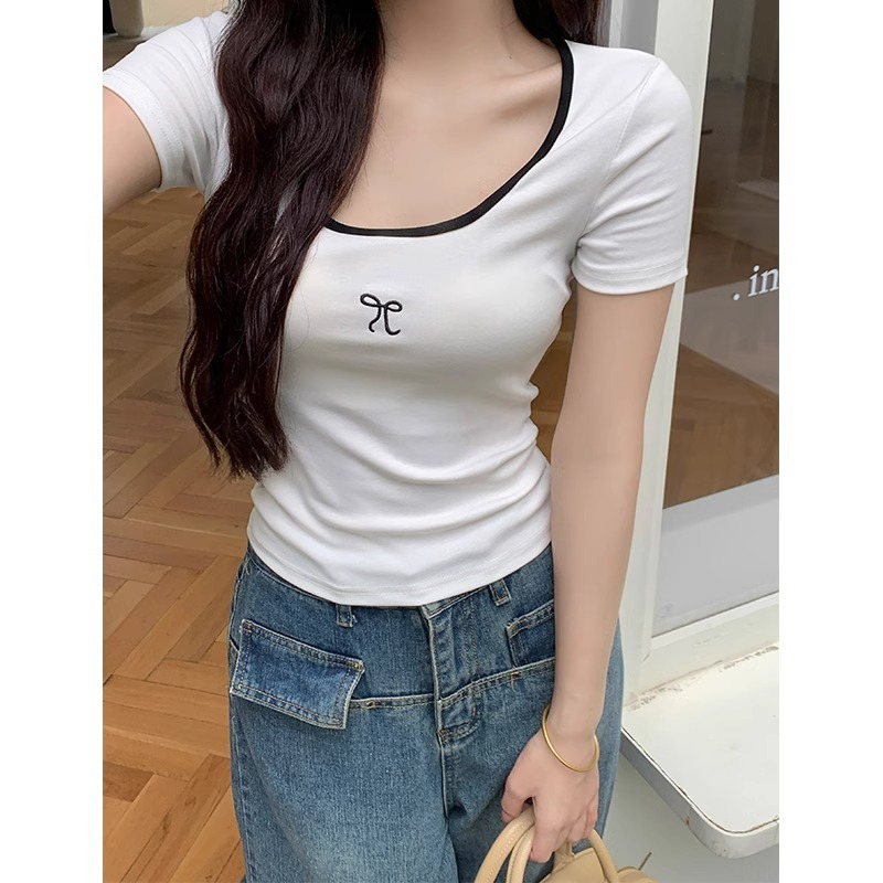 蓝色低领露锁骨刺绣蝴蝶结上衣夏季短袖女修身掐腰bm短款正肩T恤