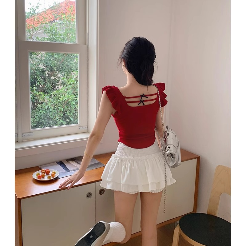 纯欲性感红色露背短袖t恤女夏修身显瘦低领露锁骨蝴蝶结别致上衣
