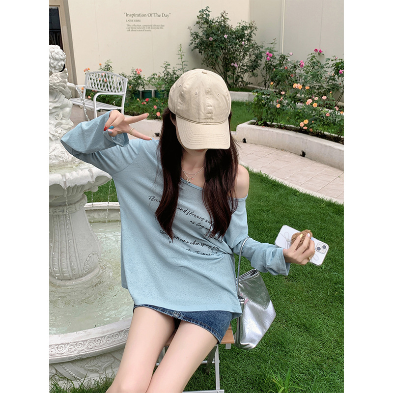 字母印花宽松微透薄款上衣大领口防晒空调罩衫长袖凉感T恤女夏季