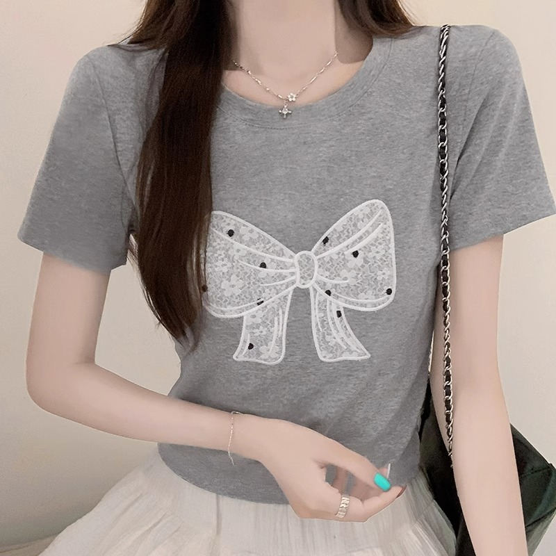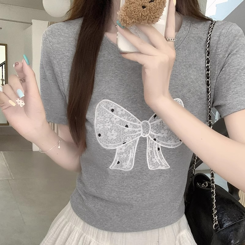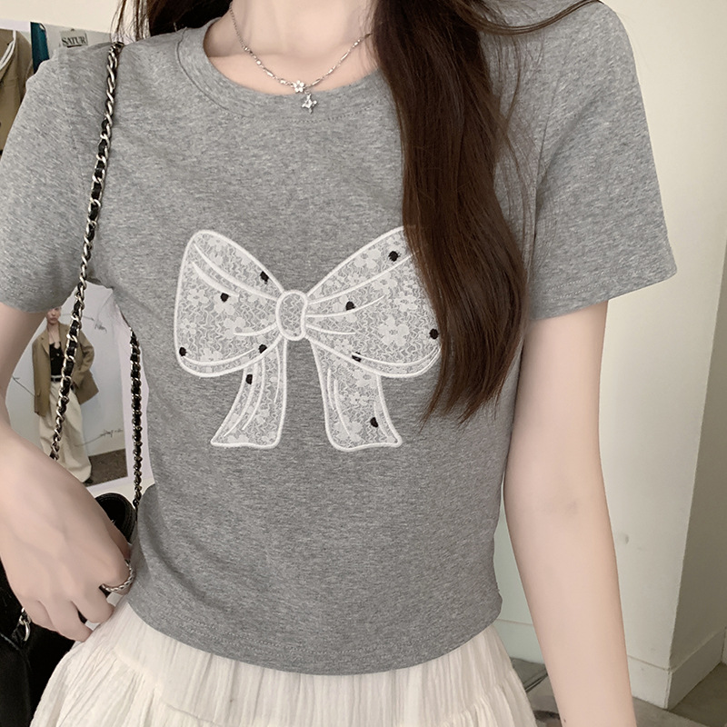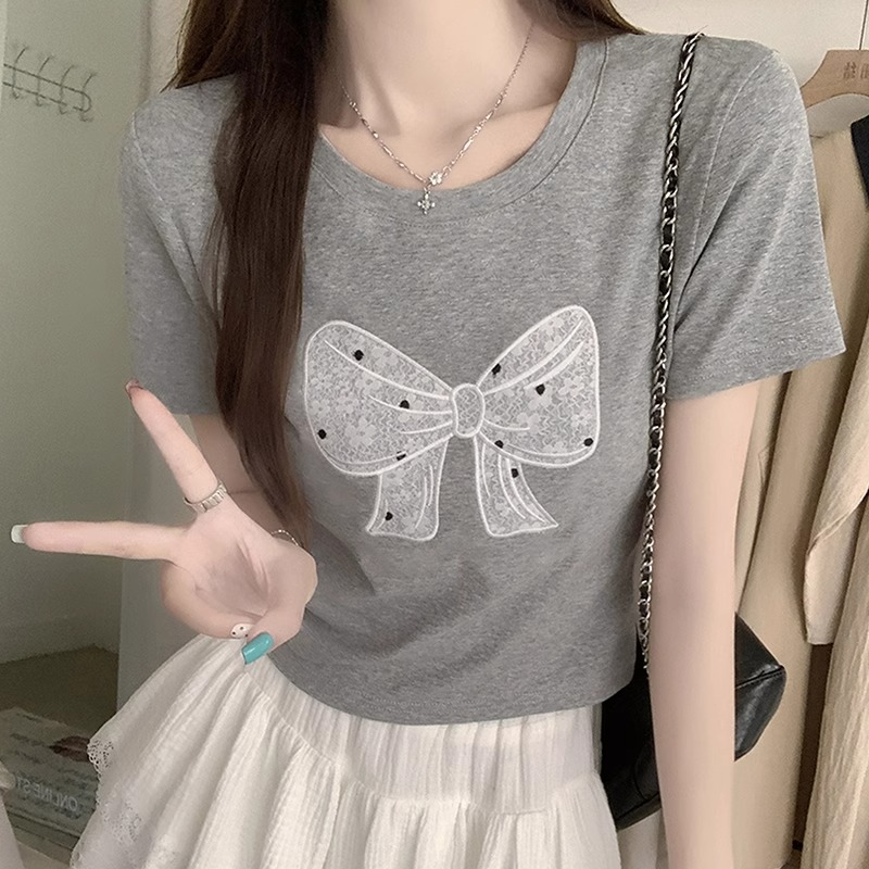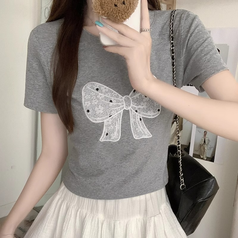 法式复古圆领短款蝴蝶结上衣正肩露锁骨短袖夏季百搭女款T恤