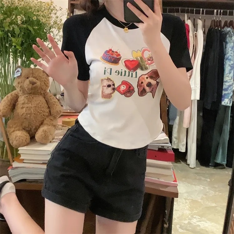 短袖t恤女修身大码插肩袖正肩微胖女孩穿搭显瘦辣妹短款上衣女夏