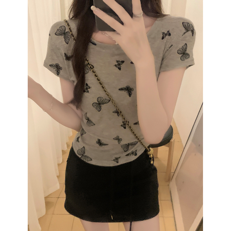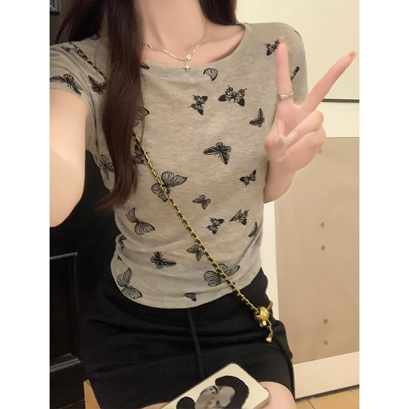 灰色蝴蝶印花正肩短袖T恤女夏季甜辣妹设计感褶皱收腰短上衣